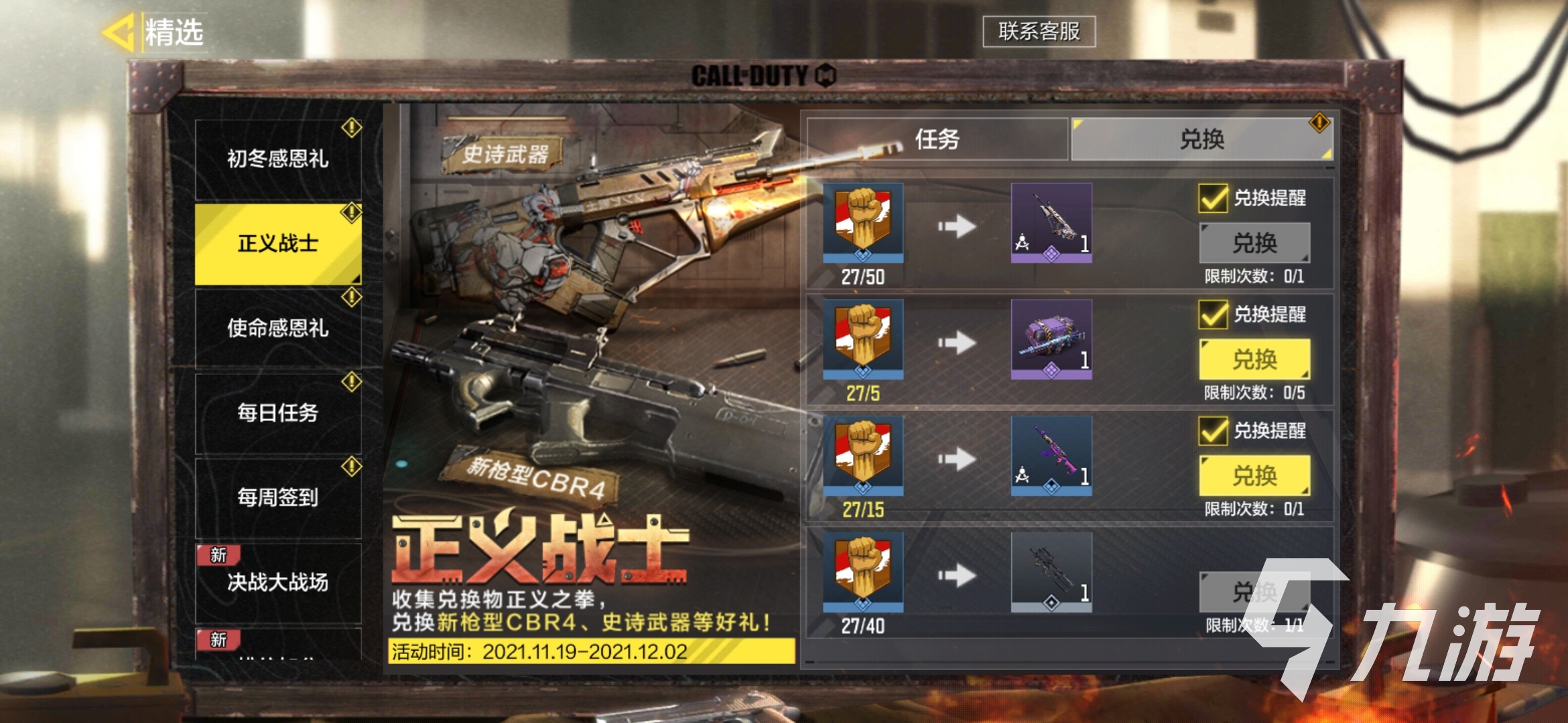 首先CBR4這款武器現(xiàn)在只需要做活動(dòng)就可以獲得哦,只要玩家收集了40個(gè)正義之拳就可以免費(fèi)兌換這款新武器啦!還沒有換的小伙伴快去收集。