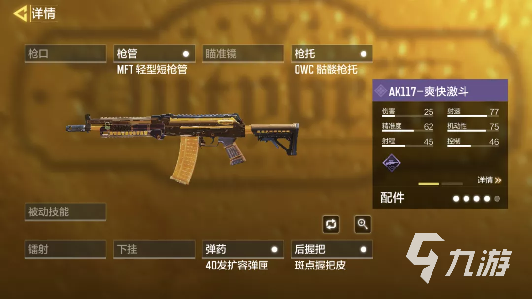 這款皮膚裝備了MFT輕型短槍管、OWC骷髏槍托、以及斑點(diǎn)握把皮,這樣搭配的AK117,減少了23%的舉鏡時(shí)間,提高了17%的舉鏡移速,機(jī)動(dòng)性得到了大幅度的提升,很好的優(yōu)化了使用手感,再加上40發(fā)的擴(kuò)容彈匣后,續(xù)航能力也得到了不錯(cuò)的改善,由于后坐力的提升的也不高,使其在中距離的發(fā)揮自身優(yōu)勢(shì),一舉制裁敵人。
