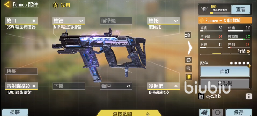 Fennec-幻陣螺旋本身的配件泛用性也很高,在獲得這把武器后完全不需要額外搭配其他配件使用:OSW輕型補(bǔ)償器+MIP短槍管賦予了這把槍極快的開火時(shí)間,在突發(fā)接觸敵人時(shí)能夠更快地開火爭取先機(jī)。而OWC戰(zhàn)術(shù)鐳射則帶來了輔助瞄準(zhǔn)效果,提升了腰射的命中率。這套配件唯一的缺點(diǎn)在于精準(zhǔn)度過低,因此對于一些剛?cè)肟拥耐婕叶钥赡艽嬖谥^高的上手門檻。