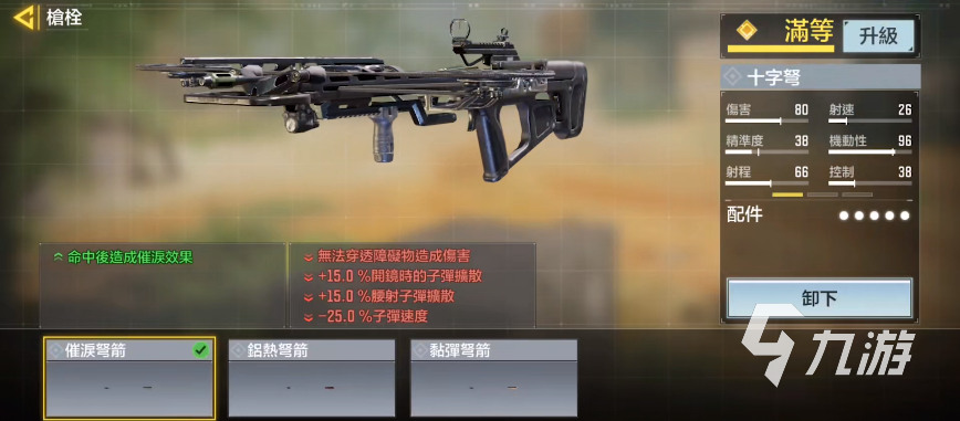 來源: 極光 作者: 忎訸 2021年09月10日 19:18使命召喚手游近日推出了一把全新的副武器:十字弩,這也是使命召喚手游中第一款遠程攻擊型冷兵器。很多小伙伴想知道使命召喚手游十字弩配件怎么選,那么今天小編就為大家分享一套十字弩的配件搭配,幫助大家更快速地上手這把武器。