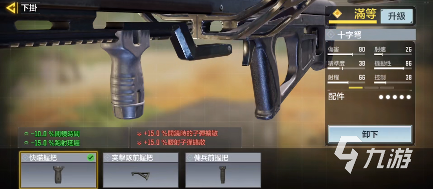 然后是下掛配件,由于上述兩個配件對十字弩的移動速度和開鏡時間都有著負面的影響,而實戰(zhàn)中十字弩作為副武器,機動性還是很關(guān)鍵的。因此小編選擇了快瞄握把這個下掛配件來彌補絞弦和重型弓臂的不足。