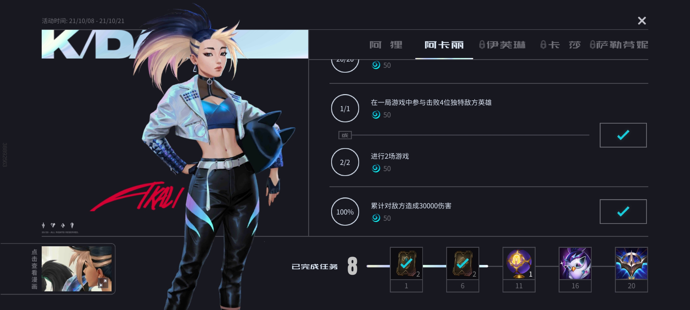 阿貍KDA任務包括:獲得金幣、累計造成魔法傷害、進行幾個場次的游戲、擊敗亞速龍、累計獲得多少擊殺和助攻。