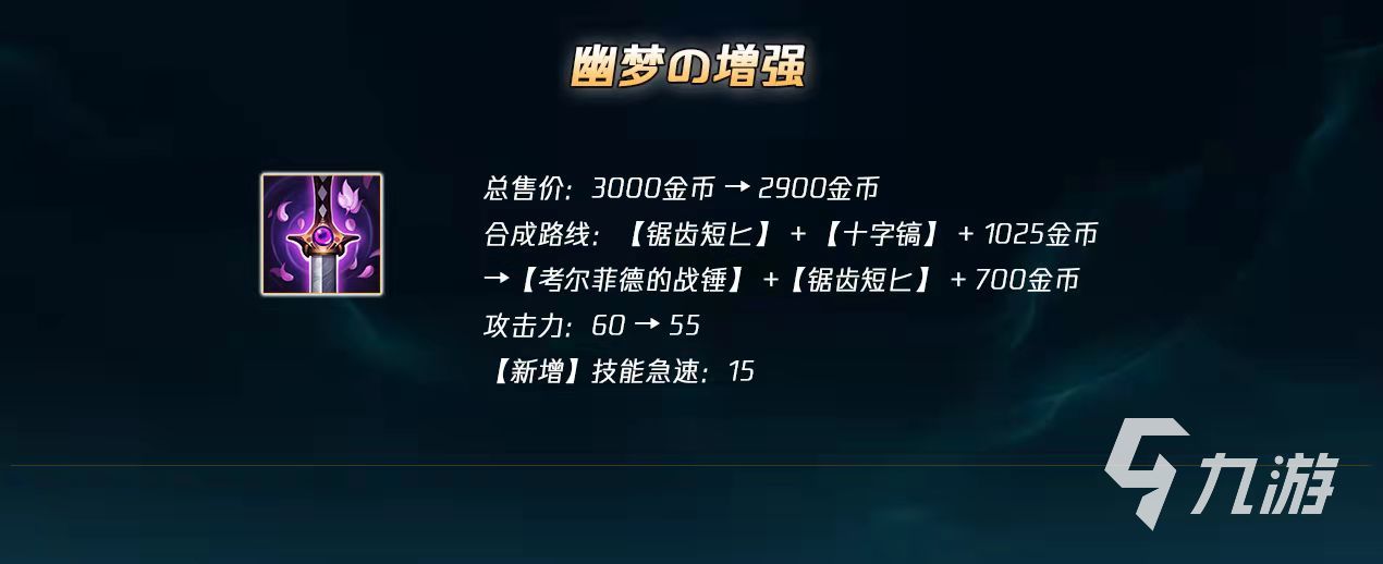 屬性大幅度增強(qiáng),價(jià)格下降,同時(shí)用5點(diǎn)攻擊力換來(lái)了15技能急速,合成配方也發(fā)生了改變。幽夢(mèng)之靈之所以在S11出場(chǎng)率如此低,就是因?yàn)榫奚咧捞珡?qiáng)、幽夢(mèng)沒(méi)技能急速、幽夢(mèng)太貴這三點(diǎn)。而本次對(duì)幽夢(mèng)的改動(dòng)剛好變化了這幾個(gè)痛點(diǎn)。合成配方從十字鎬變成了戰(zhàn)錘,使得幽夢(mèng)的合成變得異常平滑。
