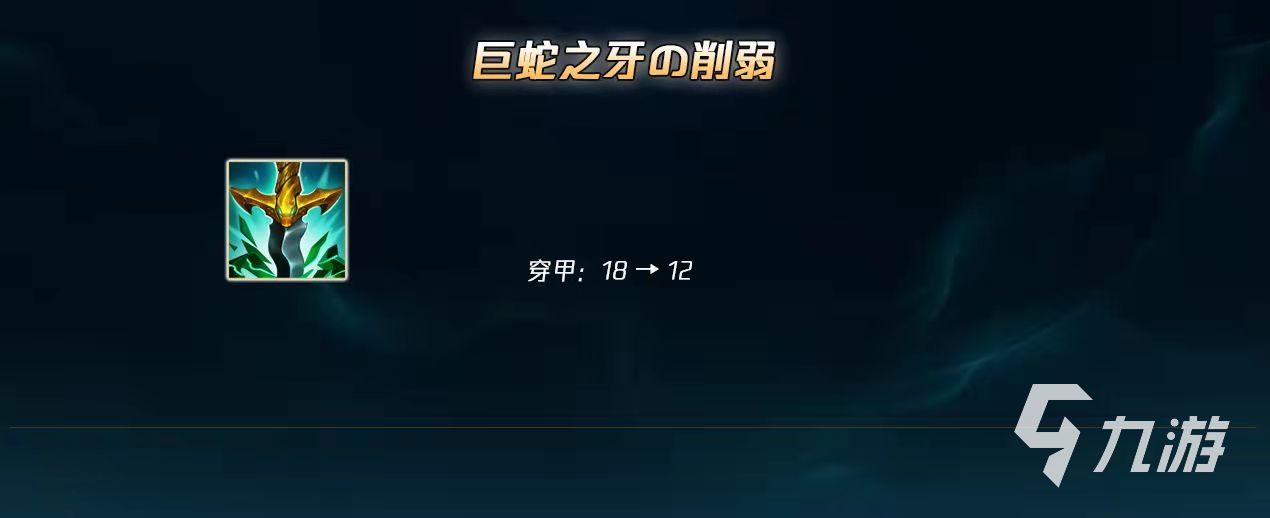 巨蛇之牙在重做之后是非常強(qiáng)力的穿甲裝,價(jià)格便宜屬性高,還有強(qiáng)大的破盾效果。這次改動(dòng)大幅度降低了巨蛇之牙的穿甲效果(18=>12),從幽夢(mèng)/幕刃級(jí)別下降到排眼刀的級(jí)別。