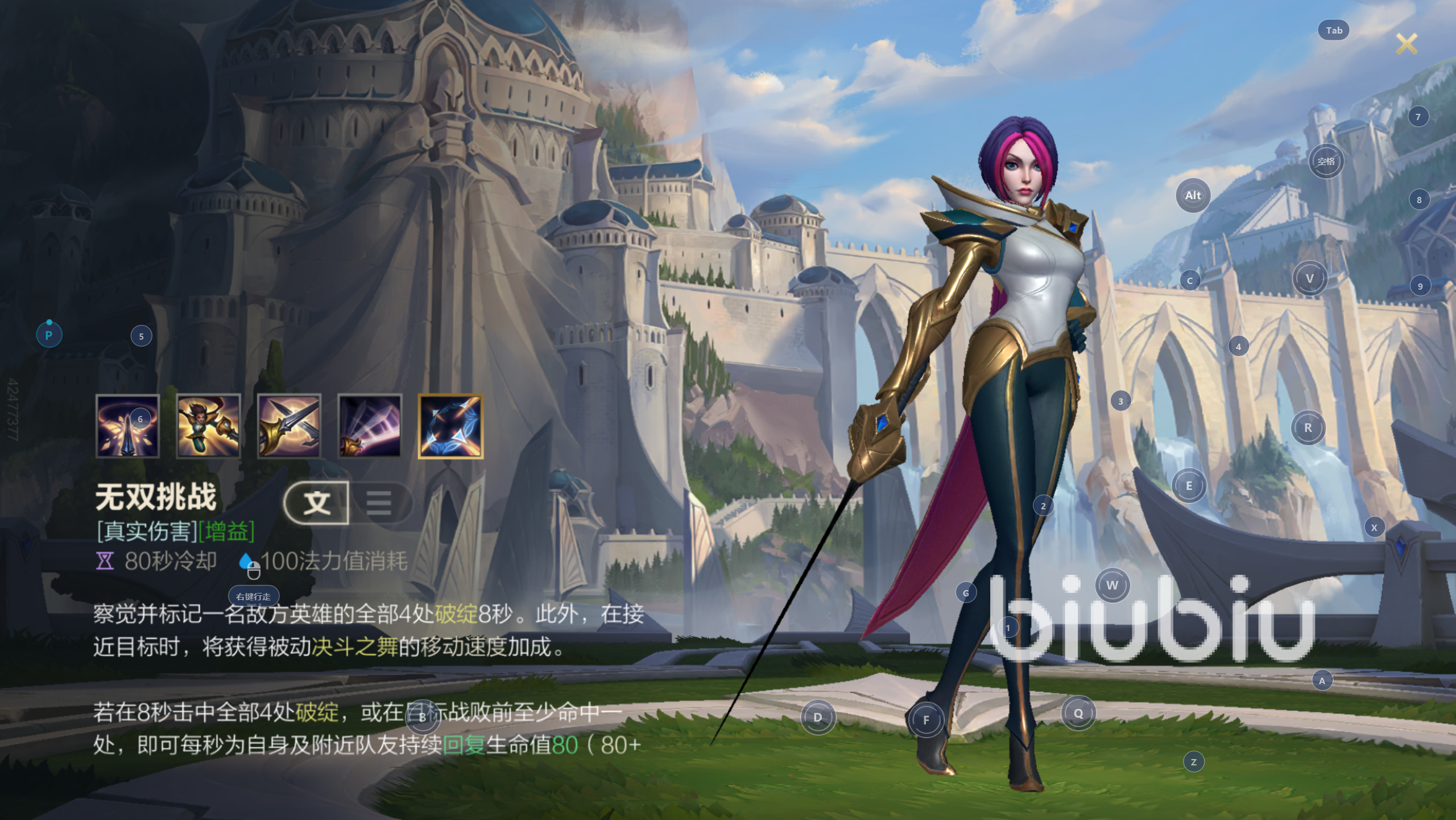 W技能是劍姬的保命技能,可以在技能釋放期間抵擋一切傷害,并且抵擋住控制技能之后還會(huì)使敵人眩暈。E技能則是強(qiáng)化之后兩次普攻的威力,使劍姬可以在一瞬間內(nèi)爆發(fā)出高額的傷害。R技能可以讓敵人的四周出現(xiàn)破綻,我們要快速的把這四個(gè)破綻打出,之后就能出現(xiàn)一個(gè)劍陣給我們回血。另外四個(gè)破綻打出之后最高可以打出百分之十的真實(shí)傷害。