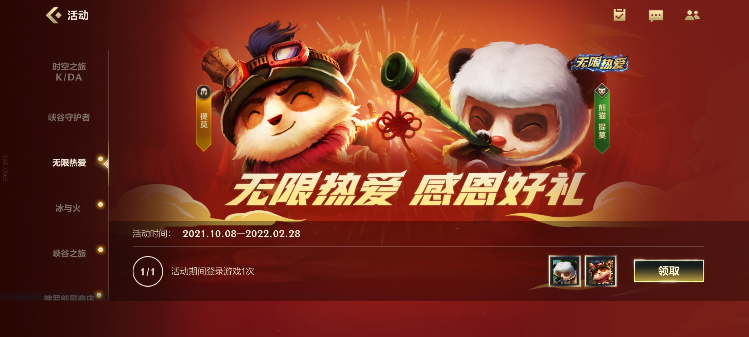 當(dāng)我們完成新手引導(dǎo)之后就可以自由操作界面了,這個(gè)時(shí)候我們點(diǎn)擊左側(cè)上方的“活動(dòng)進(jìn)行中”——左側(cè)第三個(gè)“無限熱愛”——進(jìn)入無限熱愛界面——點(diǎn)擊領(lǐng)取即可完成這個(gè)活動(dòng)!