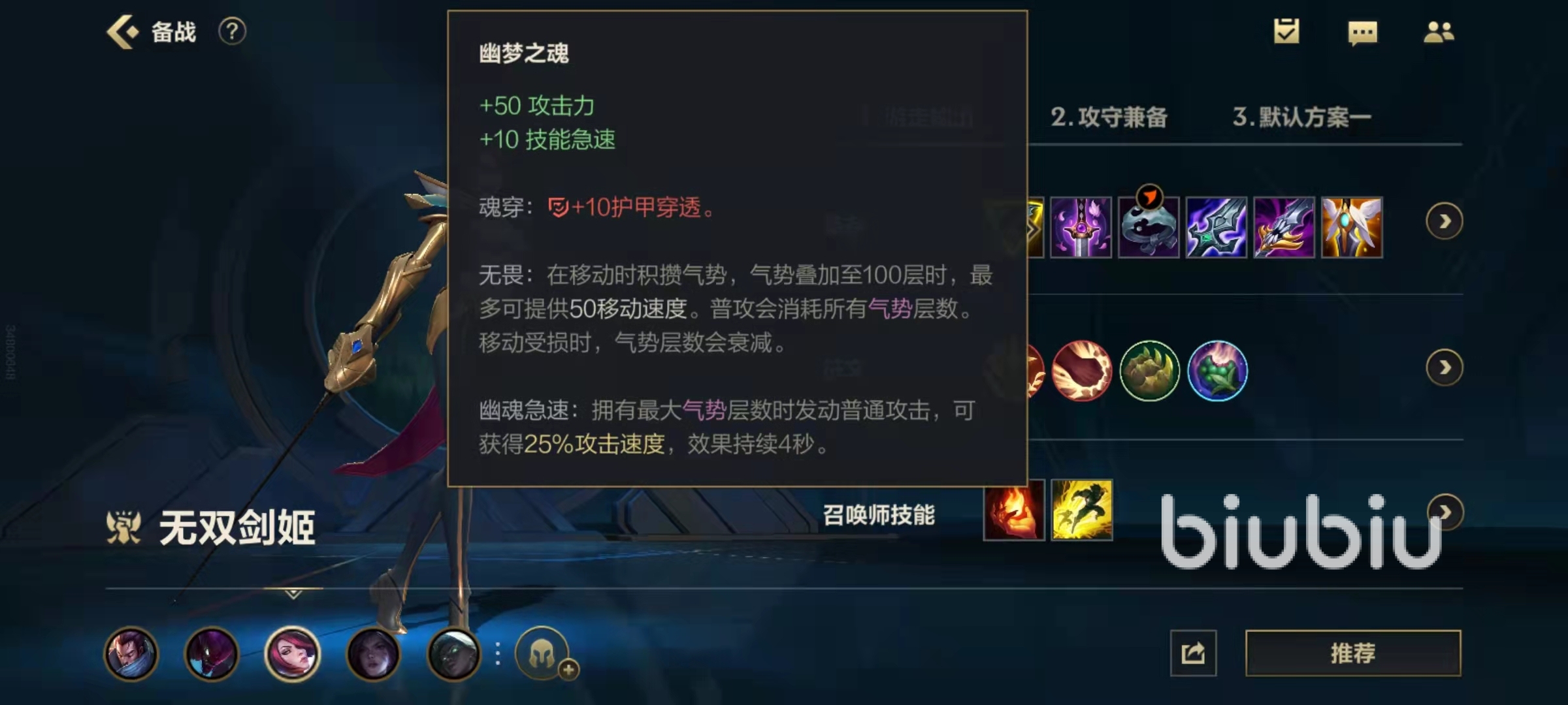 還有就是三相之力附加的狂暴效果,每次普攻累計增加移動速度,擊敗敵人獲得高額移動速度加成,無雙劍姬為了更好地擊中敵人的弱點,肯定需要進行不間斷的位移來調(diào)整攻擊的方向,所以移動速度是越多越好。幽夢之魂這件裝備可以在移動的時候積攢氣勢,在氣勢疊加起來之后增加移動速度,如果這時候發(fā)動普通攻擊,那么就可以獲得攻速加成,對于劍姬來說,這件裝備增加了切入時候的爆發(fā),配合三項能夠在剛進入戰(zhàn)斗的時候就打出高額的爆發(fā)傷害。