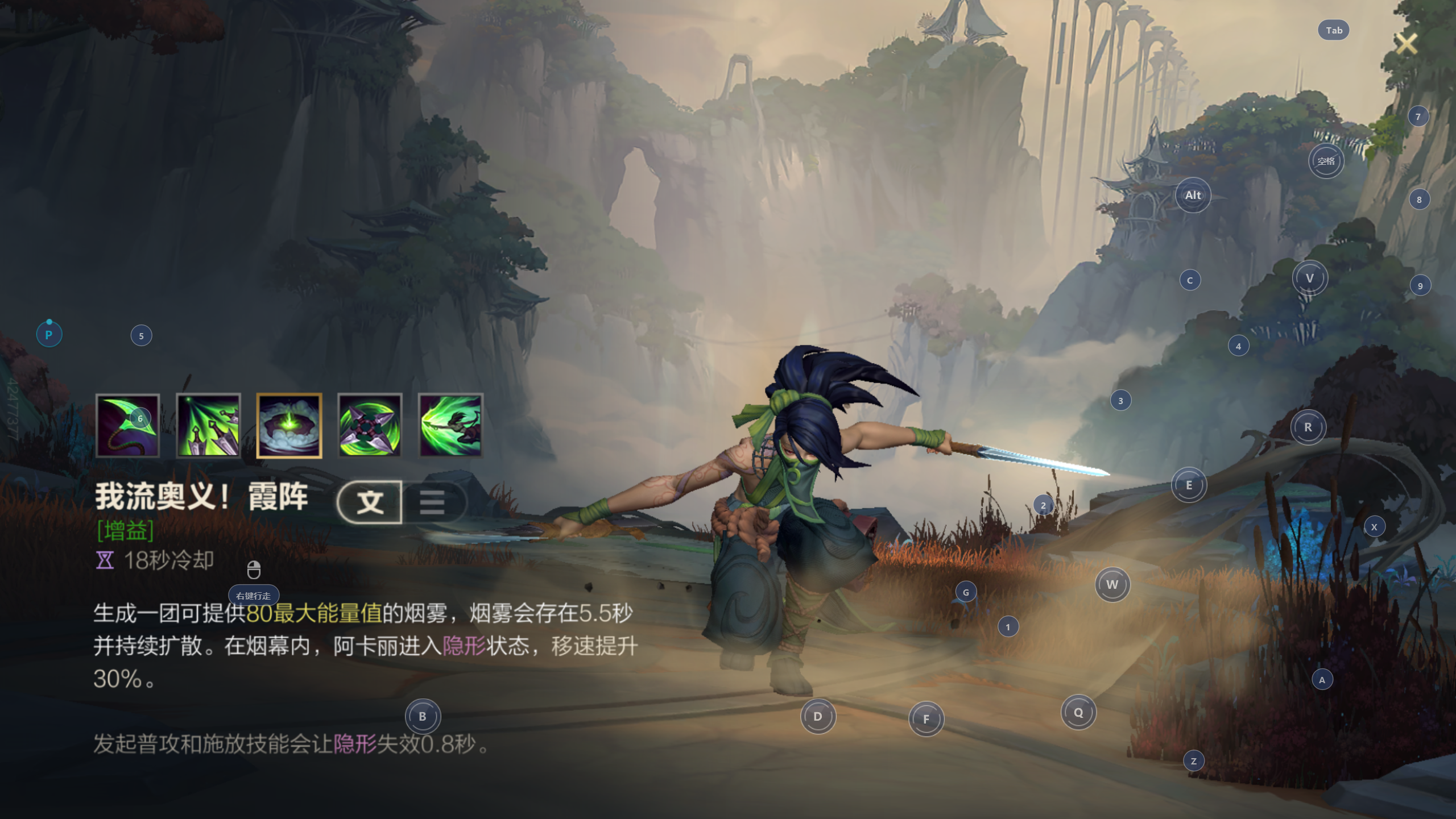 這位英雄的隱身技能是有一定限制的,我們只能釋放W技能之后在一個范圍內(nèi)隱身,一旦脫離這個范圍就會被看到,所以小伙伴們可以在這個煙霧的范圍內(nèi)秀敵人一頓操作。
