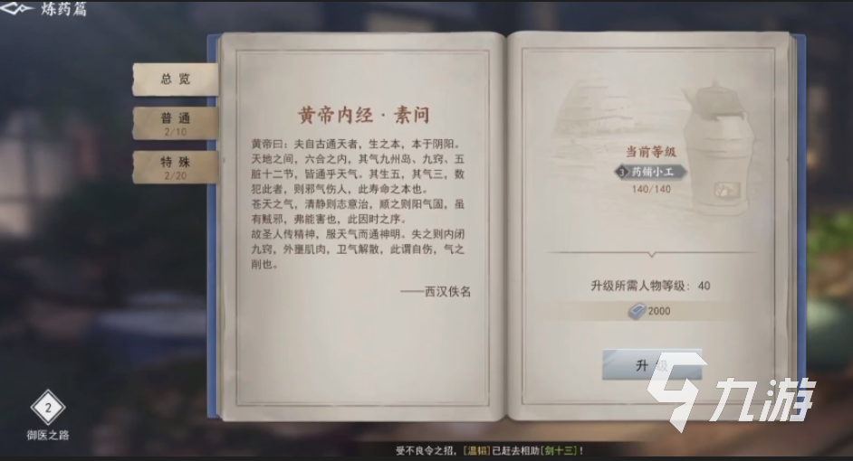 再來就是煉藥技能,煉藥制作的是一些藥品,可以在戰(zhàn)斗中進行狀態(tài)的補充。這個等級提升前期也是采藥,最好是采集一些特殊藥材,可以獲得額外的經(jīng)驗獎勵。在等級為小工之后,就要藥理任務(wù)的完成了,因為想要進行提升等級的話,任務(wù)是比較關(guān)鍵的。任務(wù)總體難度不高,之后花費碎銀來提升等級即可。