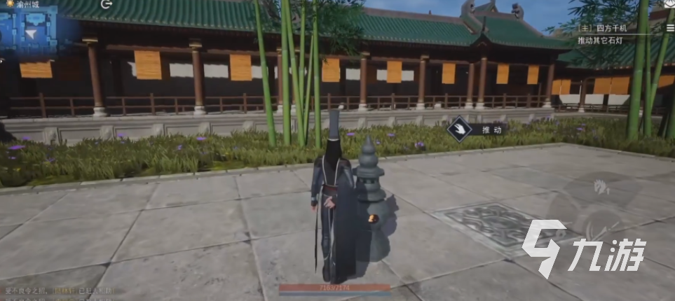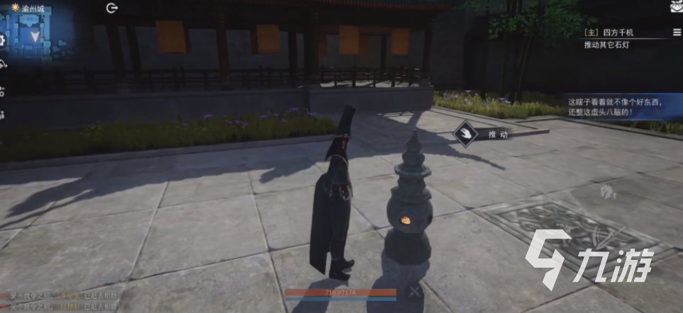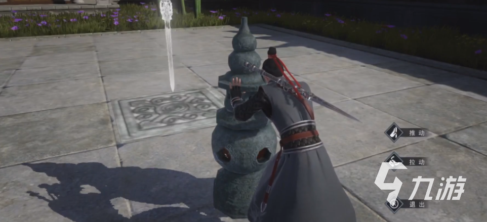先來(lái)看第一個(gè)石燈,第一個(gè)石燈就是進(jìn)入場(chǎng)景之后正對(duì)方面左側(cè)的這個(gè)。玩家在靠近之后會(huì)有推動(dòng)、拉動(dòng)和退出這三個(gè)選擇。這個(gè)石燈的操作是最為簡(jiǎn)單的,玩家只要將其推動(dòng)到左側(cè)的機(jī)關(guān)位置就行了。機(jī)關(guān)位置在地面上是比較明顯的,石板上面有花紋,其他的石板是沒(méi)有的。