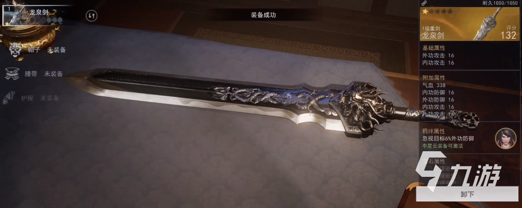 先來看一看基礎(chǔ)屬性,武器的基礎(chǔ)屬性都是外功和內(nèi)功的,龍泉劍的基礎(chǔ)攻擊是16點,內(nèi)外攻擊都一樣。這個攻擊屬性在專屬武器中不是最高的,但也是中等的一個排名,隨著等級提升,加成還是非常不錯的。