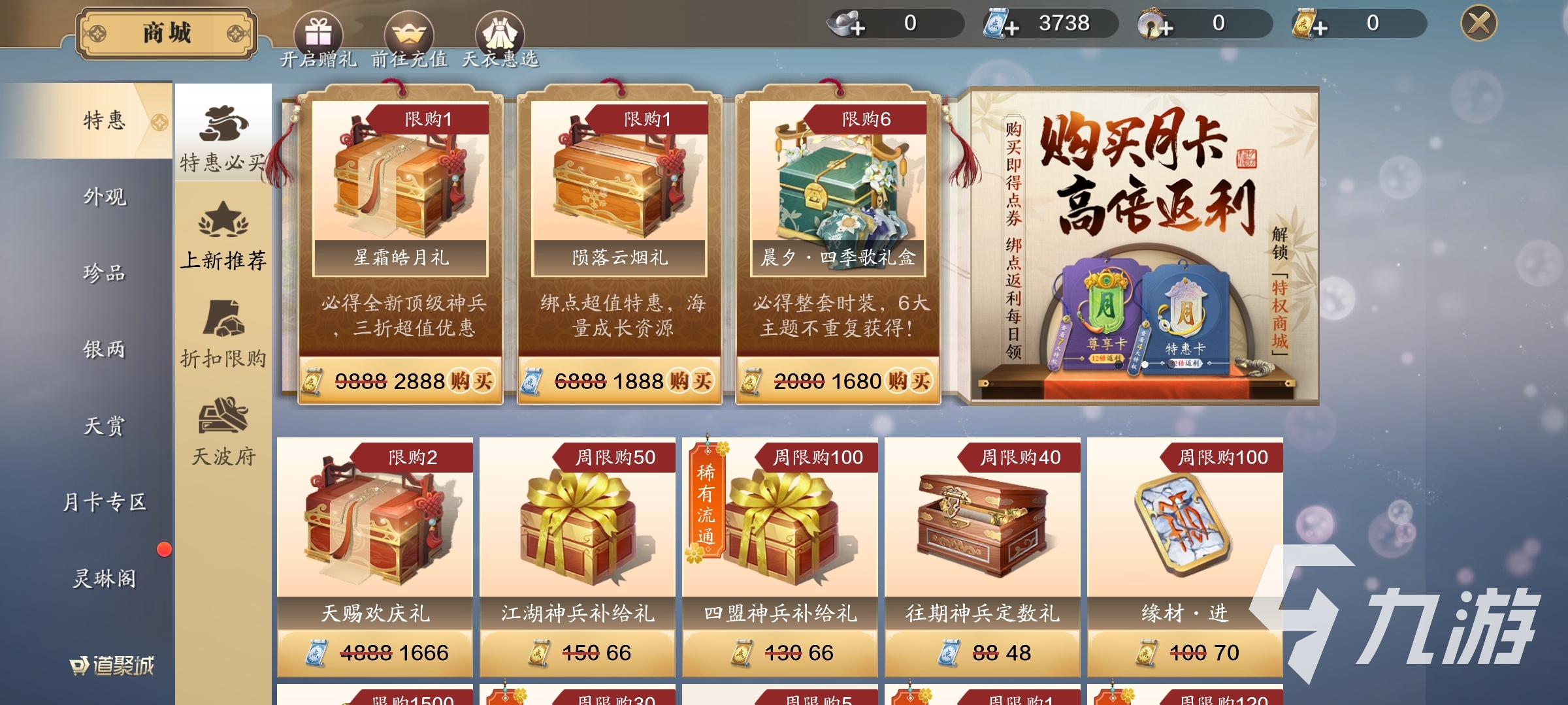 特惠商城中主要是上新了本次更新后的新版本禮包,分別是星霜皓月禮、隕落云煙禮、四季歌禮盒。星霜皓月禮盒主要是開(kāi)出金色材料,分別是滄浪劍自選禮、武林傳說(shuō)自選禮、神俠招募令、瑯紋碎片自選禮以及其他藍(lán)色級(jí)別的道具材料等。星霜皓月禮盒的價(jià)格是2888點(diǎn)券,性價(jià)比上是還是比較劃算的,有氪金的玩家可以考慮入手。