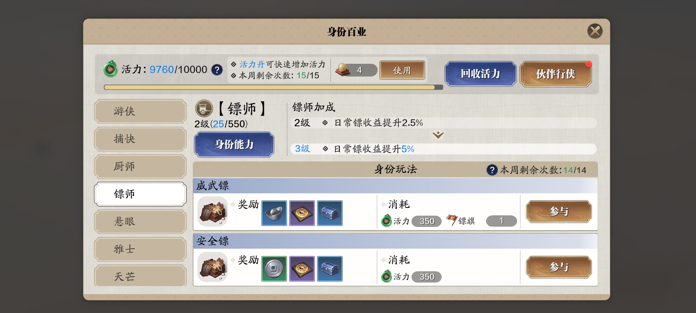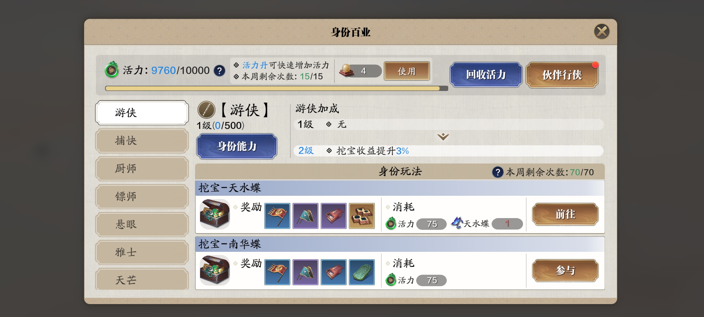 還有一個總的所有身份玩法的更新,那就是消耗活力獲取身份的經驗效率由原來的100%提升至150%,相應的身份玩法的獎勵也有所提升。天涯明月刀手游身份玩法有什么改動大家都知道了嗎?還有的細節(jié)就請大家進游戲體驗吧。