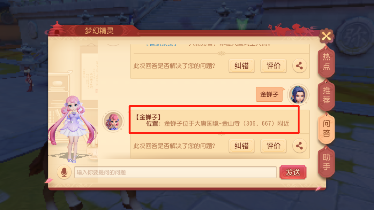 (4)夢(mèng)幻精靈:如果為大家不知道角色的坐標(biāo)也沒有關(guān)系,只要知道需要找的角色名字即可。夢(mèng)幻精靈的功能十分強(qiáng)大, 只需和他對(duì)話輸入金蟬子,夢(mèng)幻精靈就能給予玩家坐標(biāo)回應(yīng),按照招標(biāo)去尋找即可。部分角色有超鏈接功能,在精靈界面就能尋路。