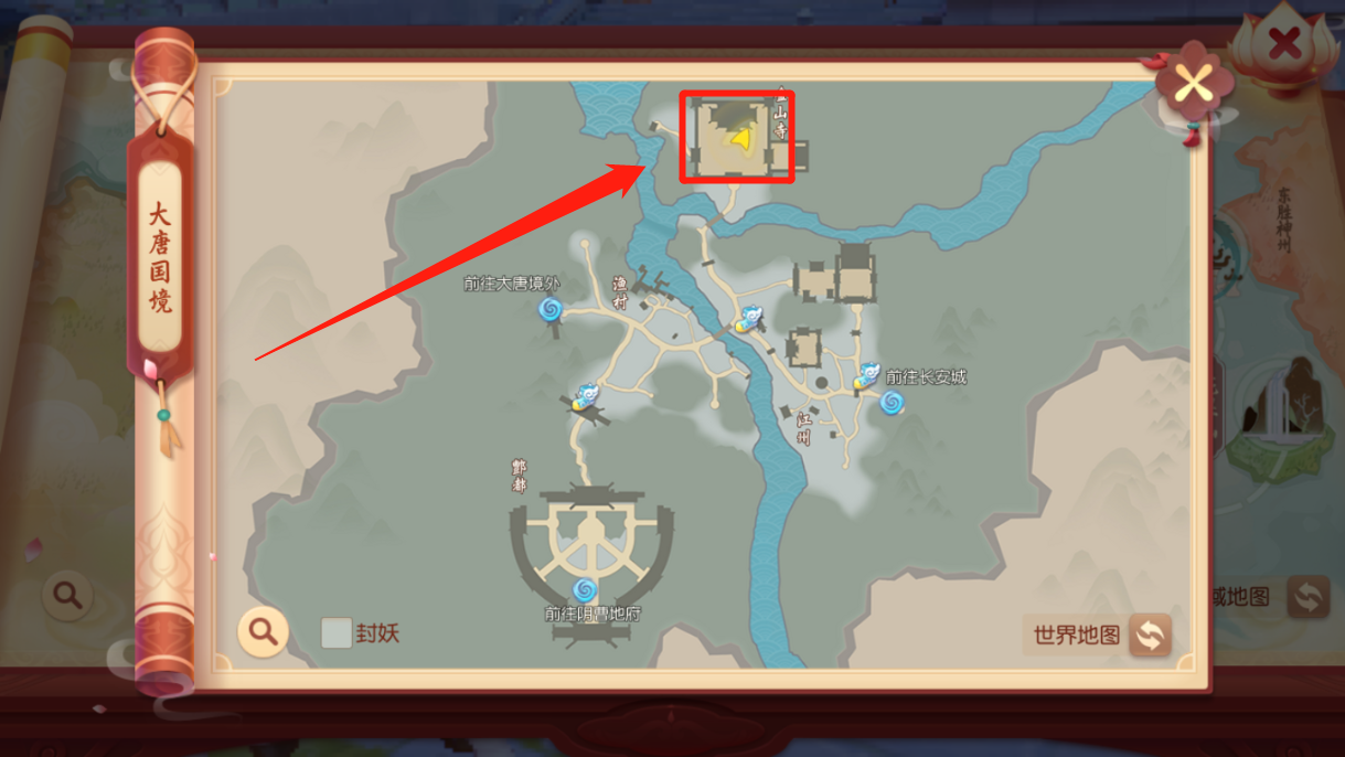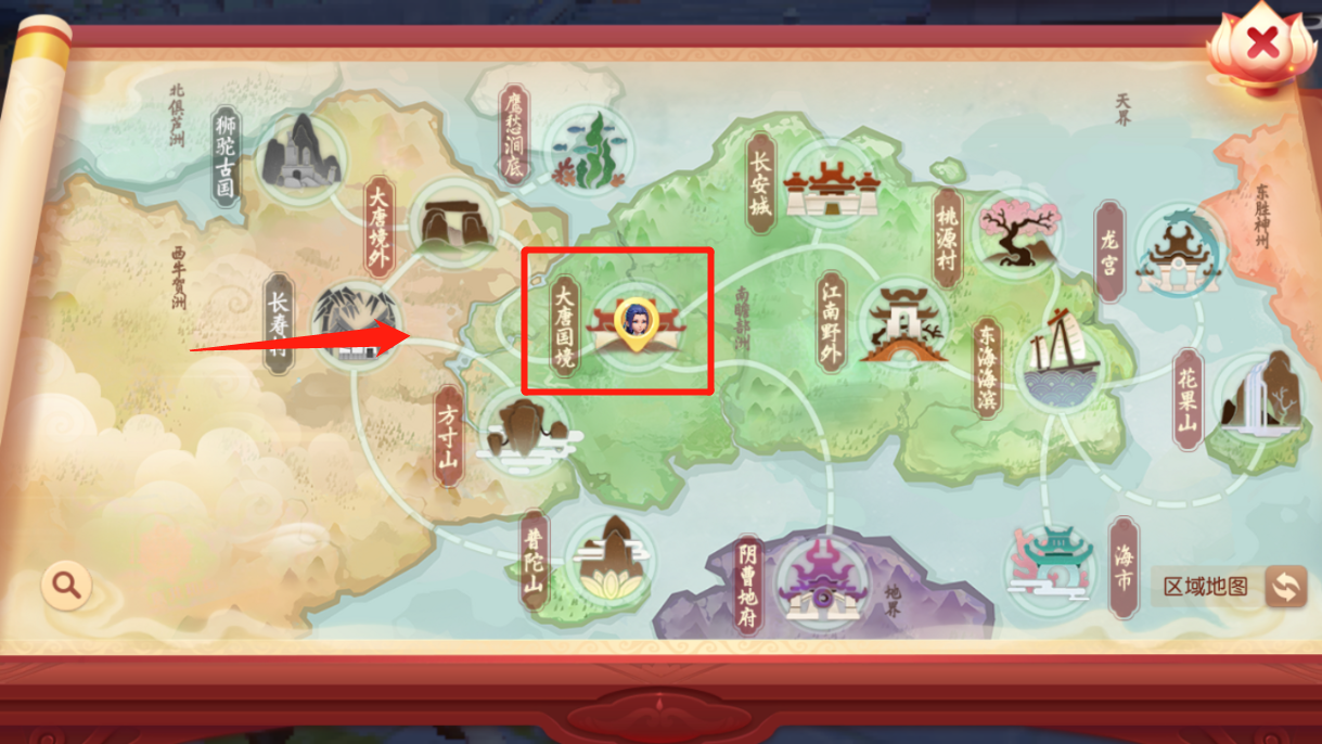 (1)手動(dòng)尋找:玩家可以點(diǎn)擊地圖的右上角查看地圖然后找到“大唐國境”,點(diǎn)擊后系統(tǒng)會(huì)自動(dòng)進(jìn)行尋路,到達(dá)大唐國境之后,按照上述的坐標(biāo)坐過去即可。