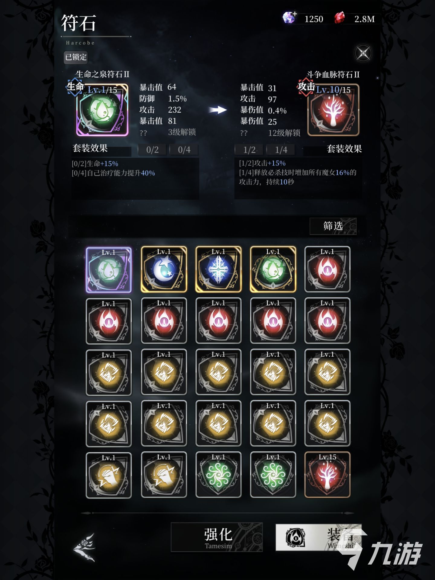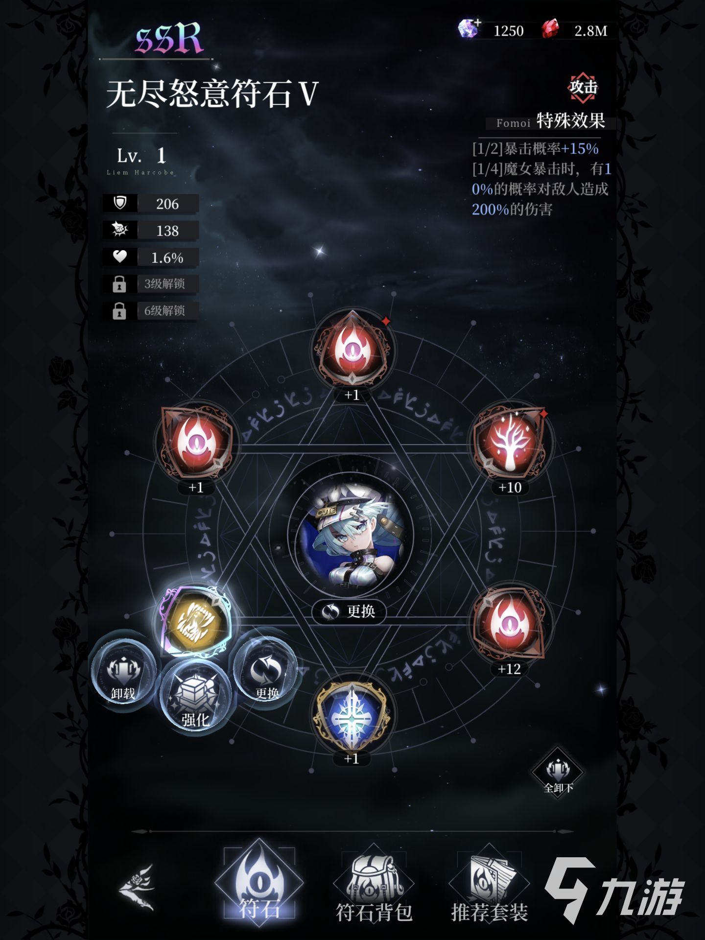 在符石玩法中每個(gè)魔女都可以安裝六個(gè)符石,而這六個(gè)位置必須得安裝相應(yīng)的屬性,比如說(shuō)最上方的位置只能吃到符石的生命效果,剩下的五個(gè)位置分別可以吃到暴擊,攻擊,爆傷以及防御,第六個(gè)位置會(huì)隨機(jī)從這五個(gè)屬性中出一個(gè),而這些符石并不是安裝上去就會(huì)提供各種屬性的加成的。