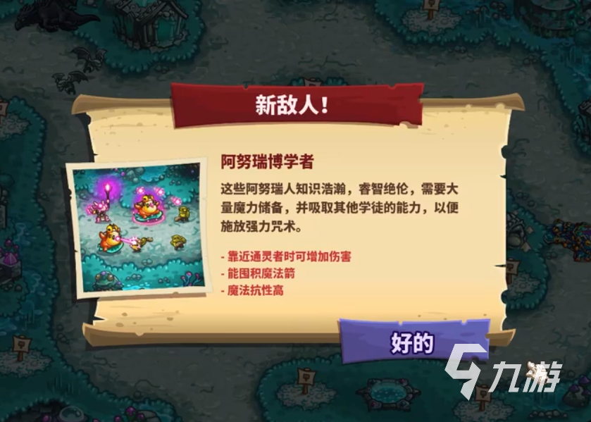 關卡中新出現(xiàn)的學徒敵人是優(yōu)先消滅的對象,學者在其身邊可以增加傷害,而水晶毀滅者在其身邊可以增加護甲;水晶毀滅者有著較高的攻擊,死亡后會產(chǎn)生爆炸,用死靈墓的靈魂附身操縱其對戰(zhàn)敵軍比較合適;總體來說,該關卡中出現(xiàn)了較多數(shù)量魔抗較高的敵人,玩家可以適當增加一些物理攻擊的防御塔來進行作戰(zhàn)。中間發(fā)亮的青蛙石像點擊后可以給己方軍隊提供一定的無敵時間。