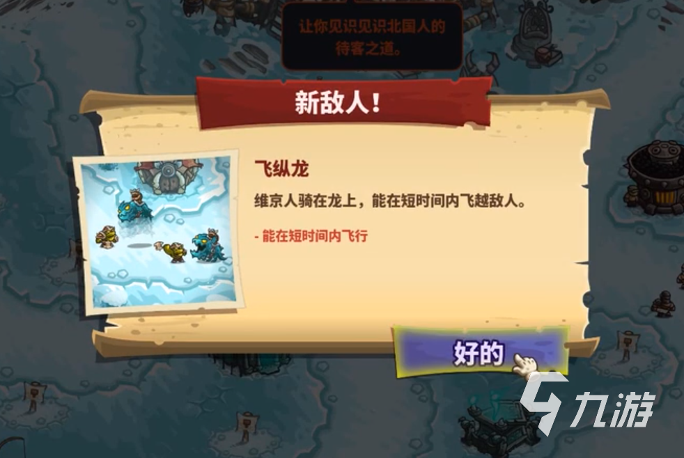 北國人村莊戰(zhàn)中會看到地圖上方站著北國人的首領并不時的說著風涼話,每間隔一定時間會對玩家的兵群投擲飛斧造成傷害,發(fā)射前有短暫的延遲提示,玩家可以操縱英雄盡量避開;飛縱龍類似矮人礦工,找準其落地點,將兵群放在其腳下等待進攻即可。