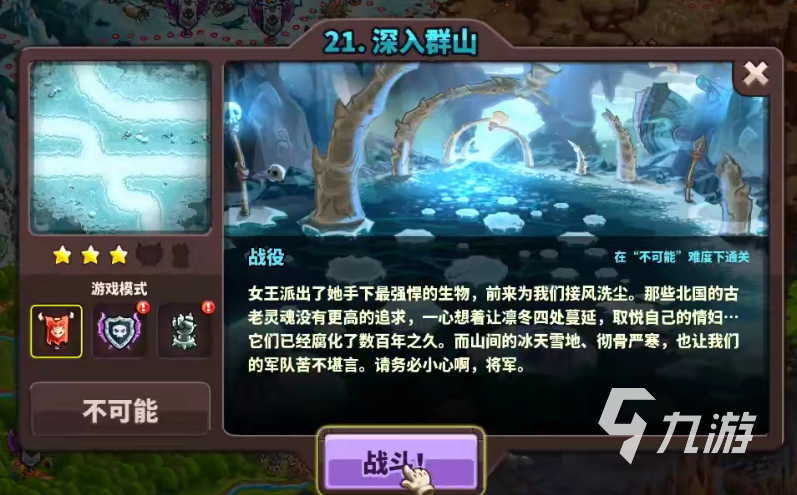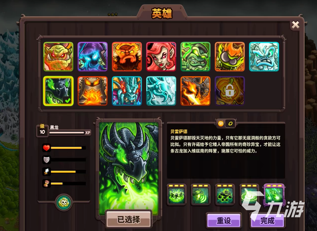 英雄選擇黑龍貝雷薩德,防御塔選擇死靈墓、熔爐、精英騷擾者和黑暗騎士。將天賦點(diǎn)滿之后,即可點(diǎn)擊戰(zhàn)斗,開始挑戰(zhàn)深入群山。