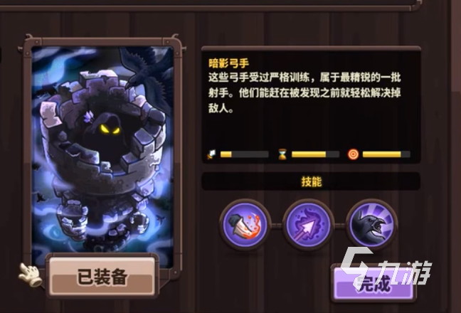暗箭弓手算是比哥布林回旋鏢好用一些的箭塔,建造所花費(fèi)的進(jìn)比較高,作為初始防御塔還是比較好用的,提升到一定等級(jí)能夠具有秒殺敵人的能力。金幣充足的情況下建造其暗影弓手防御陣型后具有較強(qiáng)的殺傷力,也有著較強(qiáng)的回復(fù)能力。作戰(zhàn)中不推薦先點(diǎn)出秒人技能,秒殺時(shí)防御塔會(huì)產(chǎn)生一定時(shí)間的僵直,優(yōu)先點(diǎn)出易傷箭是比較好的選擇。