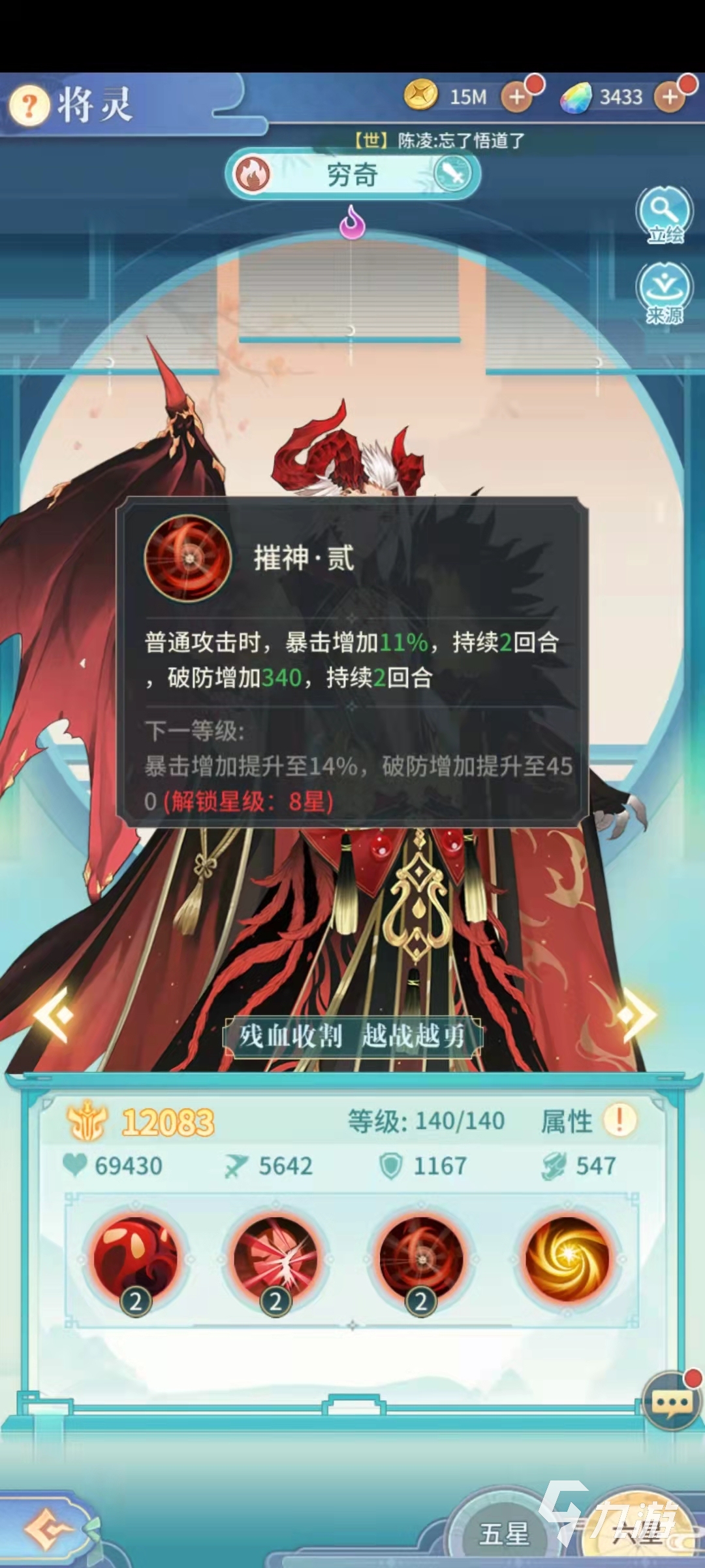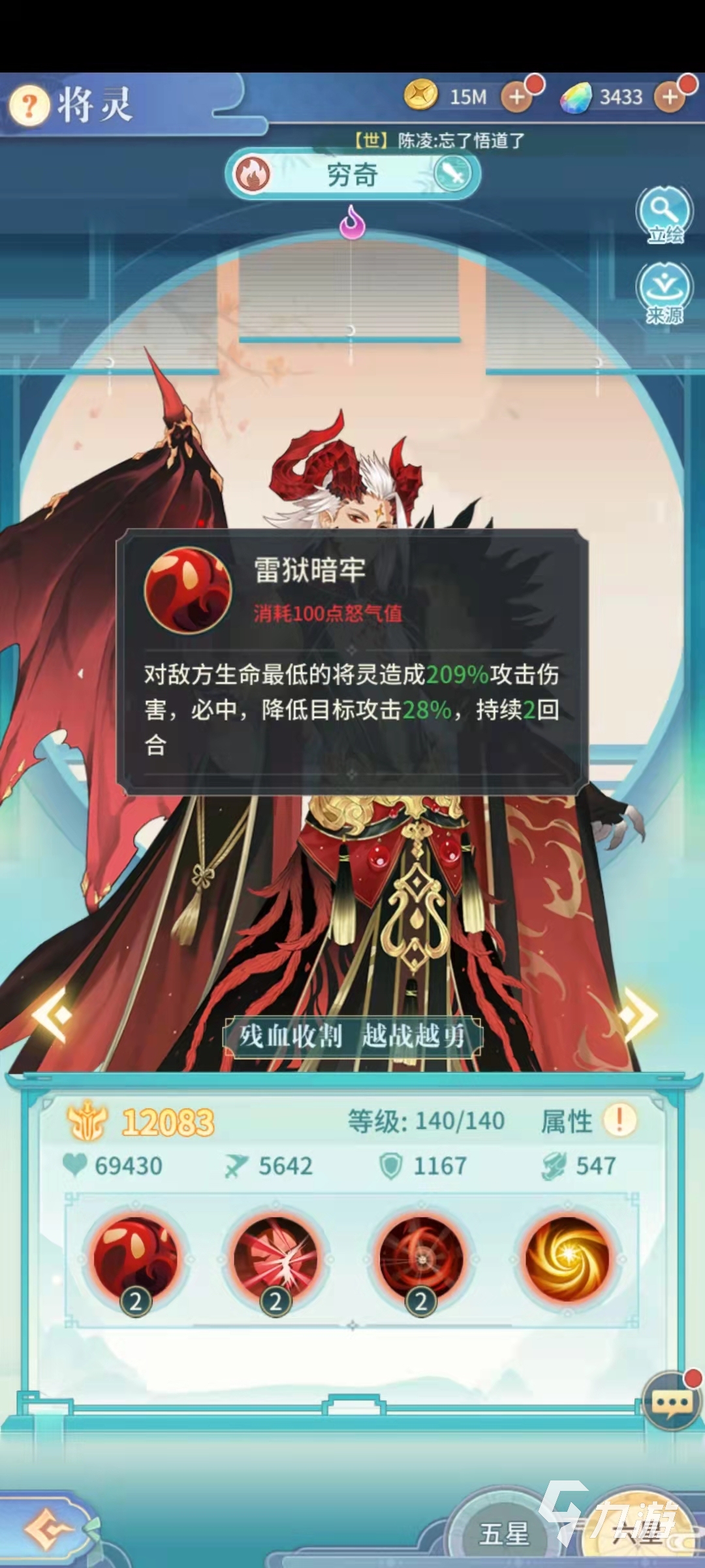 窮奇是屬于火屬性陣營(yíng)的將靈,作為武人職業(yè),窮奇擅長(zhǎng)的是殘血收割,隨著戰(zhàn)斗的進(jìn)行,窮奇的輸出會(huì)越來越高。窮奇的主動(dòng)技能效果是可以選擇敵方血量最低的單體作為目標(biāo),除了造成一次高額傷害外,還可以附加降低目標(biāo)攻擊力的效果。窮奇的這個(gè)技能傷害是必中的,也就是無法閃避,所以一些高閃避的英雄就沒有優(yōu)勢(shì)了。