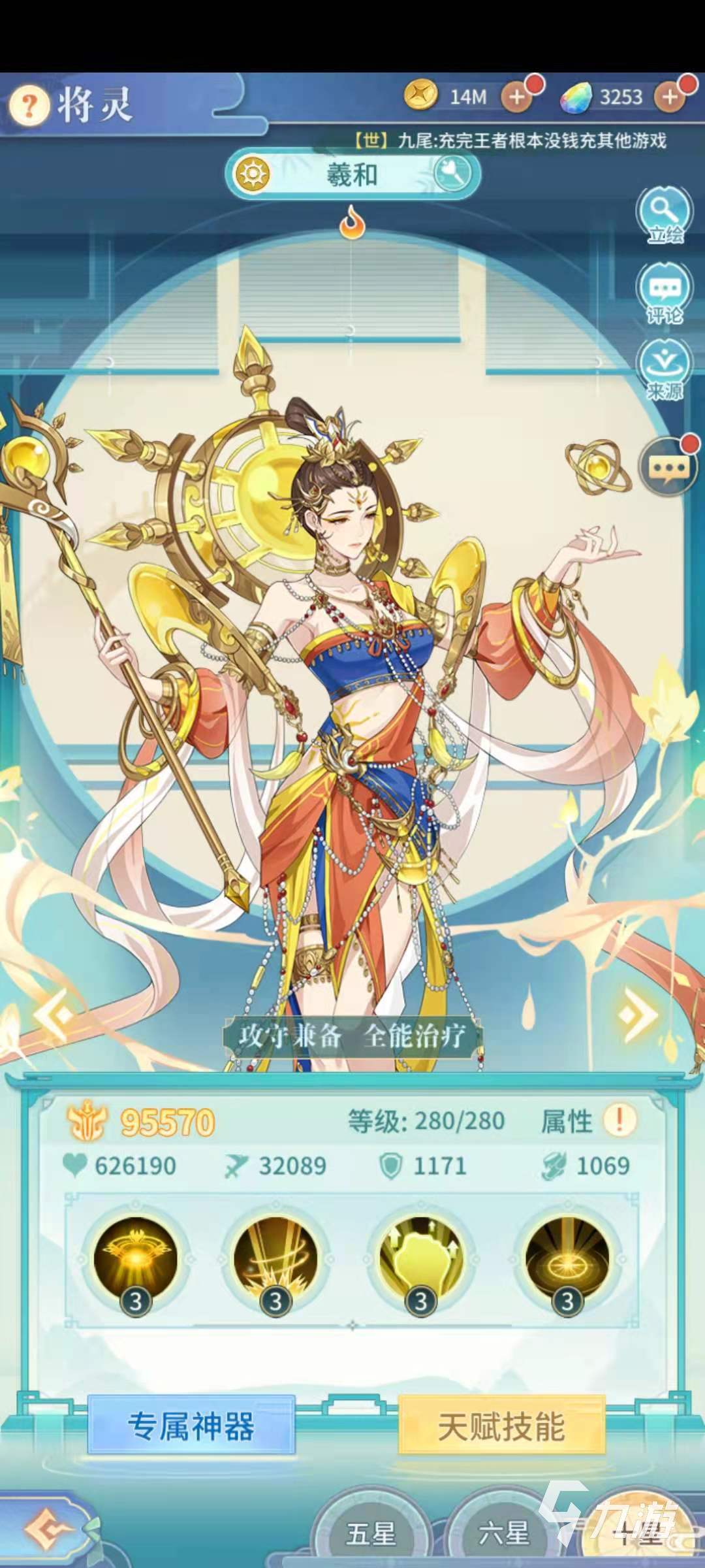 羲和是屬于術(shù)士類型的將靈,擅長的是治療隊友,羲和的主動技能是高陽灼曜,在羲和達到十四星的時候,解鎖了核心天賦之后這個技能效果就變成了對敵方全體造成一次傷害,同時為己方全體將靈恢復血量,恢復的數(shù)值是傷害值的兩倍左右。并且增加友方全體將靈的最終傷害,免暴擊幾率,接觸友方全體受到的控制效果。
