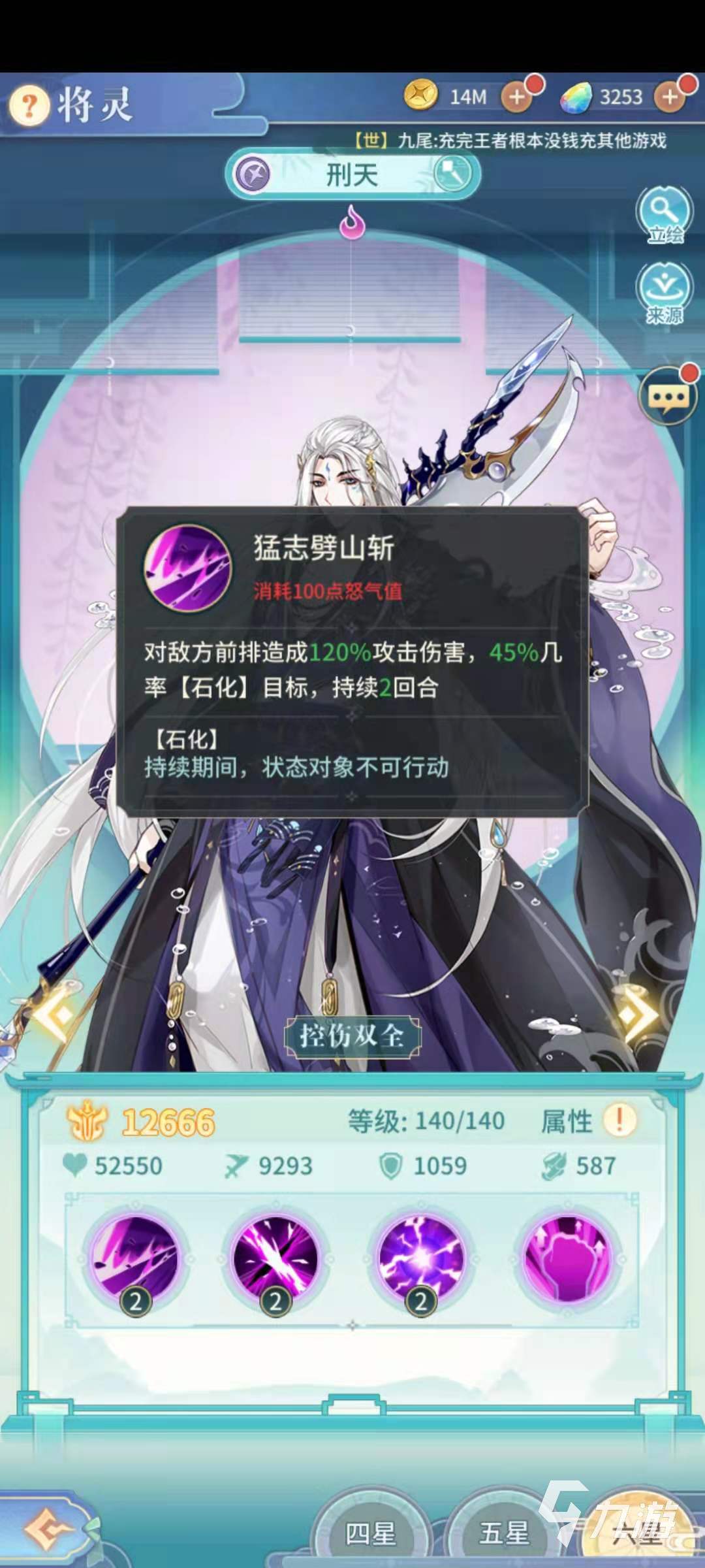刑天屬于天師類型的將靈,自身的主動(dòng)技能猛志劈山斬,可以直接攻擊敵方前排的全部將靈,造成傷害之后有幾率石化傷害目標(biāo),在六星的時(shí)候,石化的幾率是百分之四十五。這樣的幾率已經(jīng)可以保證每次技能都可以控制至少一名敵方將靈,被石化之后無法進(jìn)行任何行動(dòng)。
