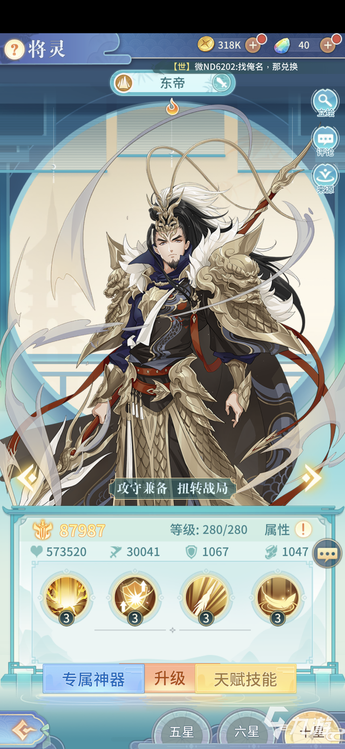 東帝這個將靈的防御能力主要來自于主動防御的效果,能夠降低敵方全體的輸出,這就變相的增加了友方的生存能力,除了技能的高額傷害以外,東帝的被動技能五岳獨尊效果也是很不錯的,只要場上有將靈陣亡,東帝就可以恢復友方的血量,還可以增加自身技能的傷害。