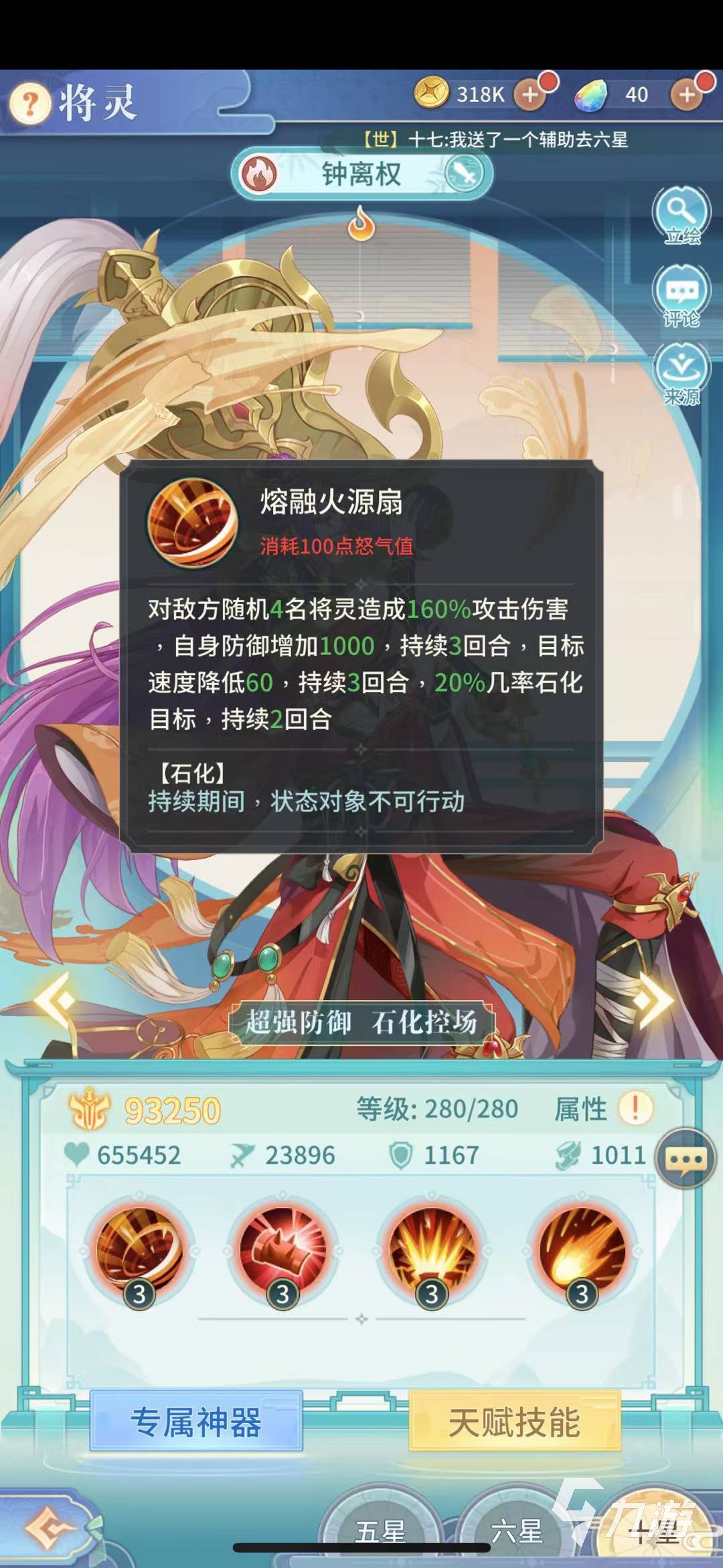 最后在帶大家看看天賦技能熔融火源扇,能夠?qū)﹄S機敵方四名將靈造成160%的攻擊傷害,自身的防御能力還會增加1000點,效果持續(xù)三個回合,目標攻擊速度降低60,關鍵是還有20%的幾率可以石化目標。