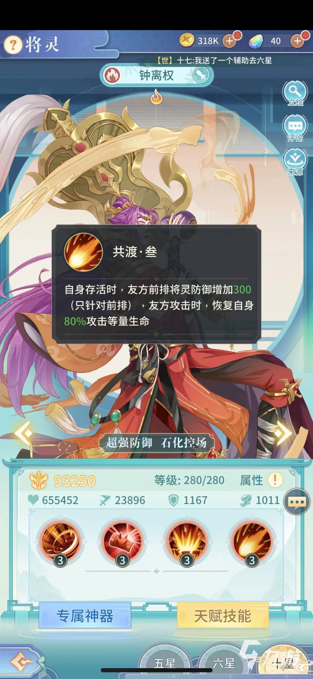 鐘離權這個將靈的定位是石化控場、超強防御,這意味著他是一個強力的前排,他的技能共渡,在自身存活的時候,友方的前排將靈防御力能夠增加300,友方攻擊的時,還可以恢復鐘離權80%攻擊的等量生命值。