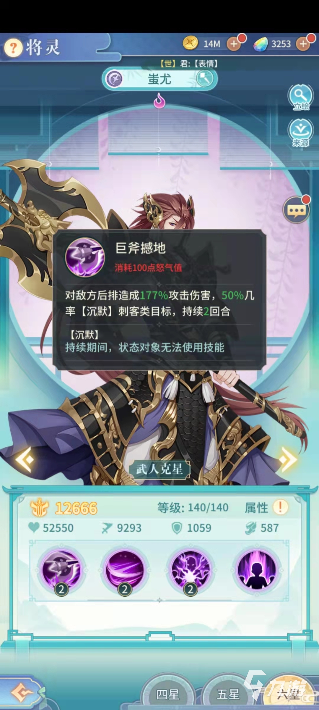 蚩尤是屬于天師類型的將靈,主動技能巨斧落地的效果是傷害敵方后排的全體將靈,并且有幾率能夠沉默傷害目標中的刺客類將靈。這需要注意的是沉默效果只有對刺客才能生效,其他的職業(yè)只會受到傷害。被動技能絕斬的效果是,使得蚩尤對于武人職業(yè)將靈的傷害提升。