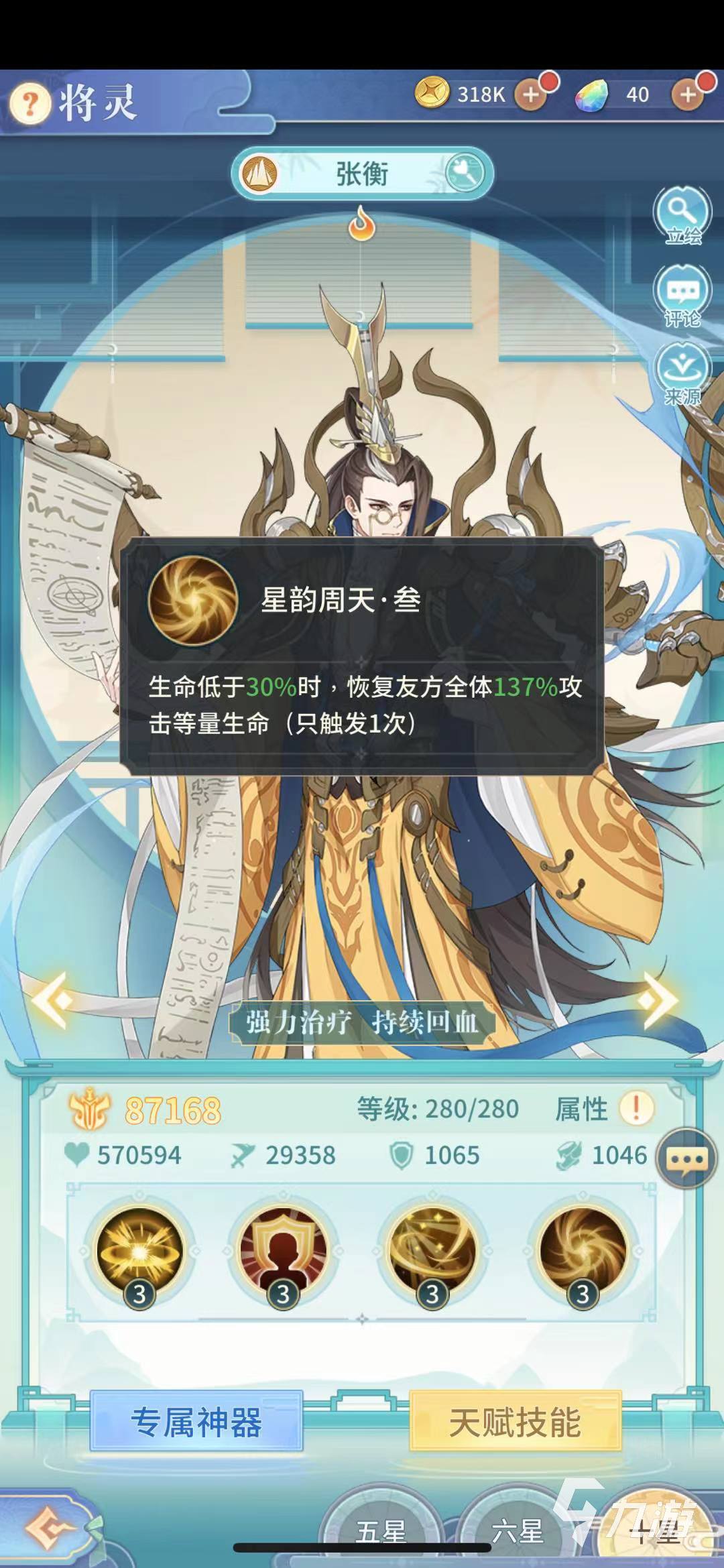 然后就是星韻周天:這個技能是非常強(qiáng)力的,在生命低于30%的時候,能夠回復(fù)全體友方137%攻擊的等量生命,這個效果還是比較強(qiáng)大的,主要是群體治療非常的實用。