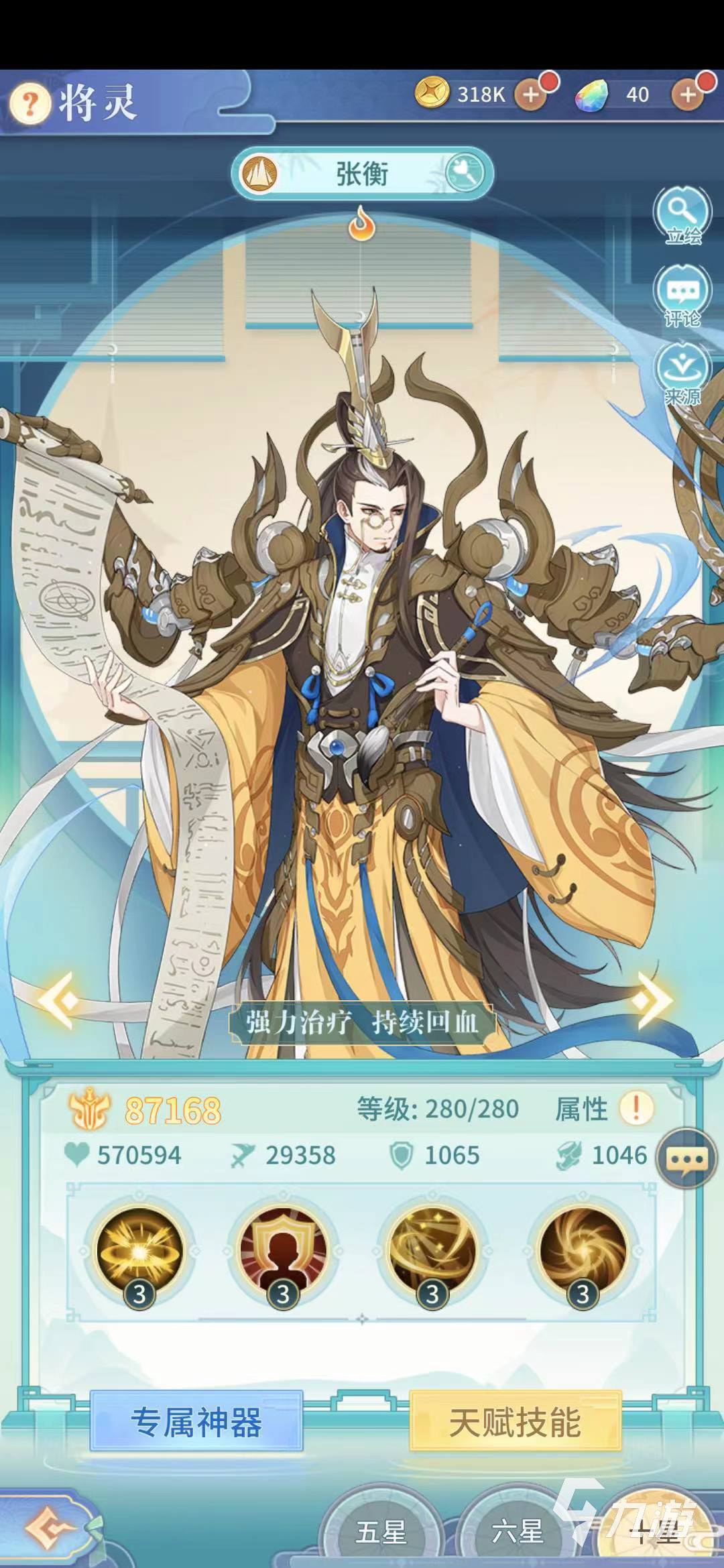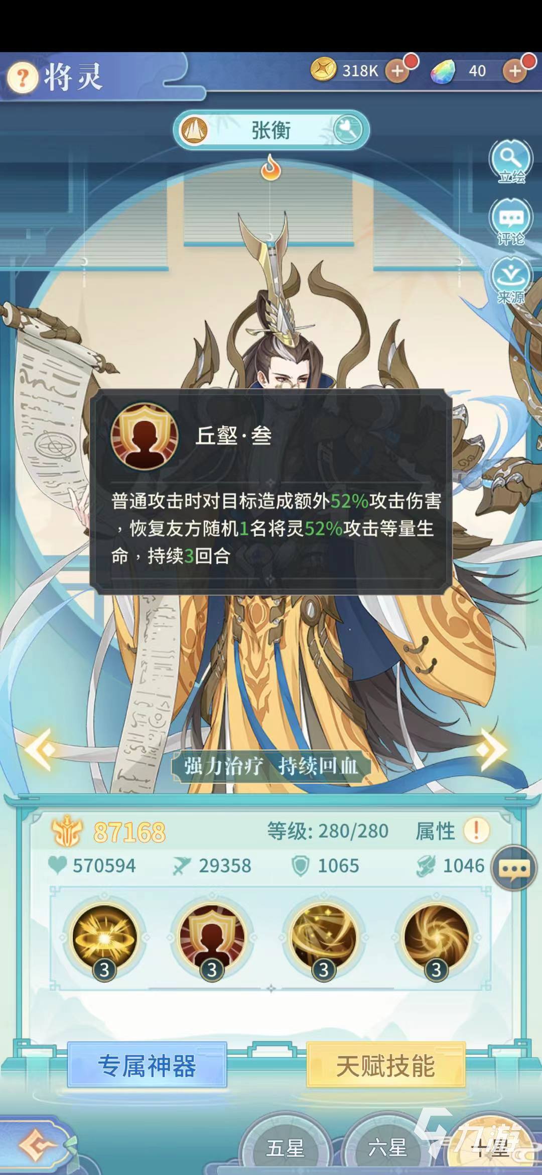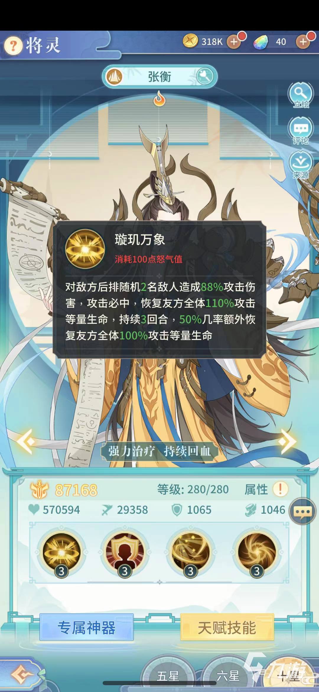 最后就是張衡的天賦技能璇璣萬象了,消耗100點(diǎn)的怒氣值,就能夠?qū)撤降暮笈烹S機(jī)兩名敵人造成88%的攻擊傷害,關(guān)鍵攻擊還必中,還能夠回復(fù)友方全體110%攻擊的等量生命,效果持續(xù)三個回合,還有50%的幾率額外的回復(fù)友方全體100%攻擊的等量生命,不得不說這個天賦技能非常的恐怖了,簡直就是救死扶傷的必備,如果有小伙伴已經(jīng)有了張衡這張卡的話,建議盡快培養(yǎng)起來哦。