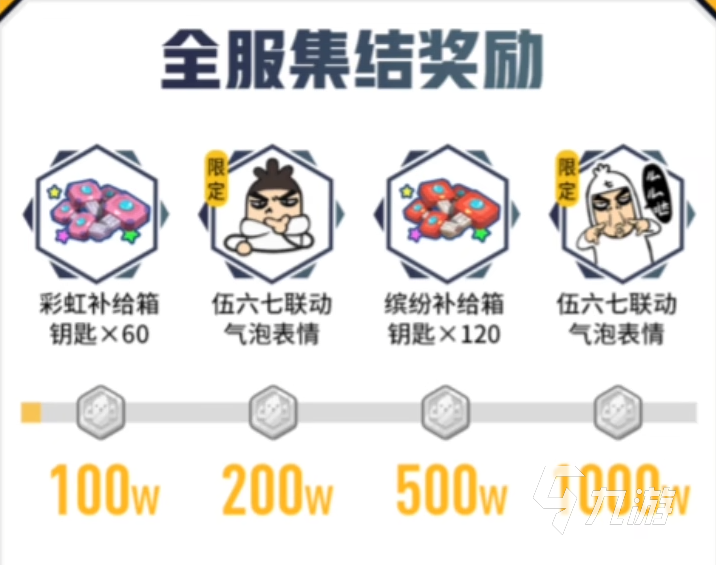 此活動(dòng)是全服參與,所有活動(dòng)前注冊(cè)的玩家均可參與,也均可獲得獎(jiǎng)勵(lì)。全服的集結(jié)度達(dá)到100w、200w、500w、1000w之后,分別可獲得彩虹補(bǔ)給箱鑰匙*60、伍六七聯(lián)動(dòng)氣泡表情一、繽紛補(bǔ)給箱鑰匙*120、伍六七聯(lián)動(dòng)氣泡表情二。對(duì)于雙廚玩家來(lái)說(shuō),非常有紀(jì)念意義。