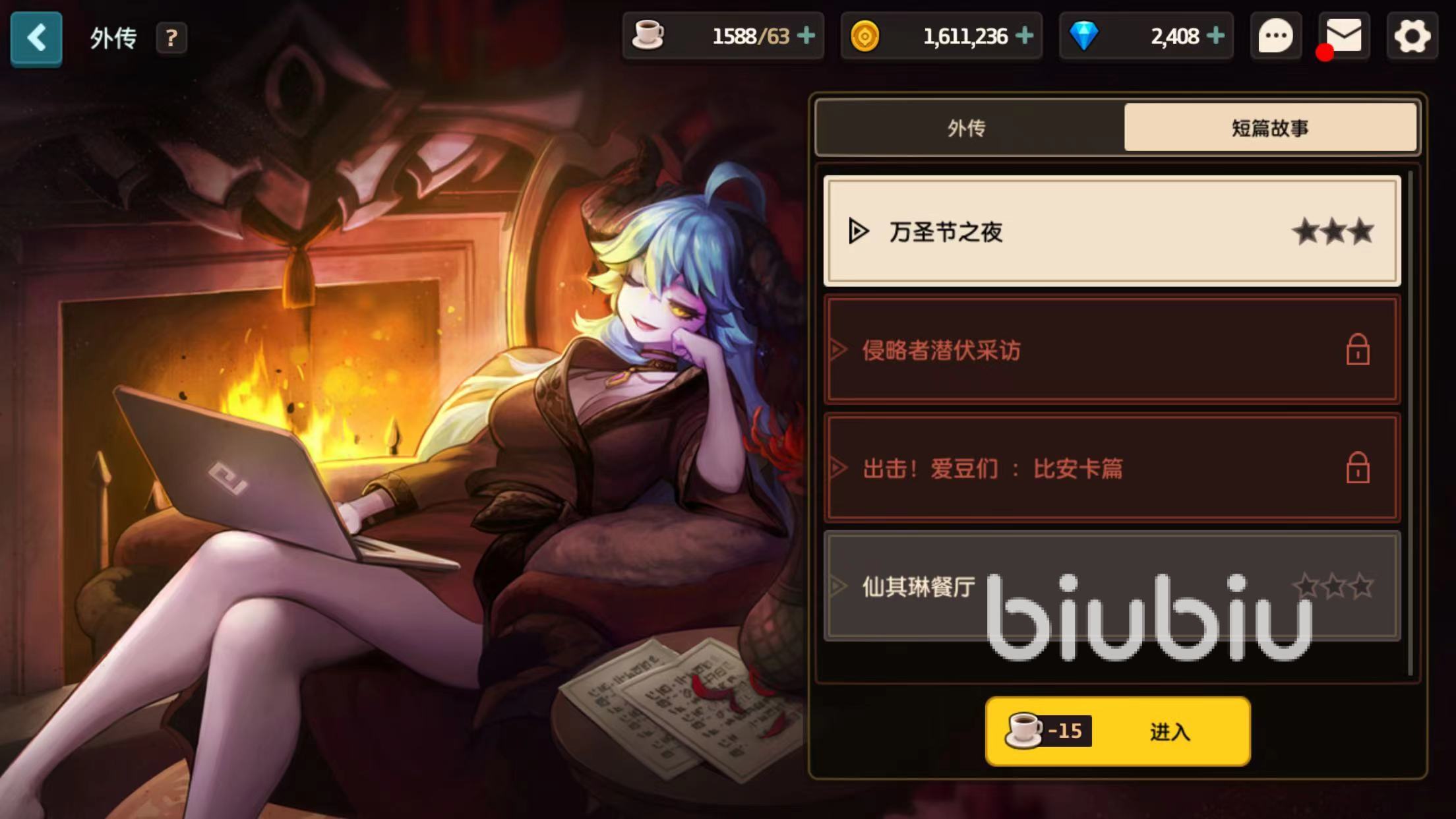 玩家進入游戲后,可以在主頁面中看到多個短篇故事,在新活動中增加短篇故事-萬圣節(jié)之夜短篇故事,想要參與新短篇故事的小伙伴們可以通過biubiu加速器下載,通過坎公騎冠劍加速器還可以免費提升游戲速度,輕松暢游。