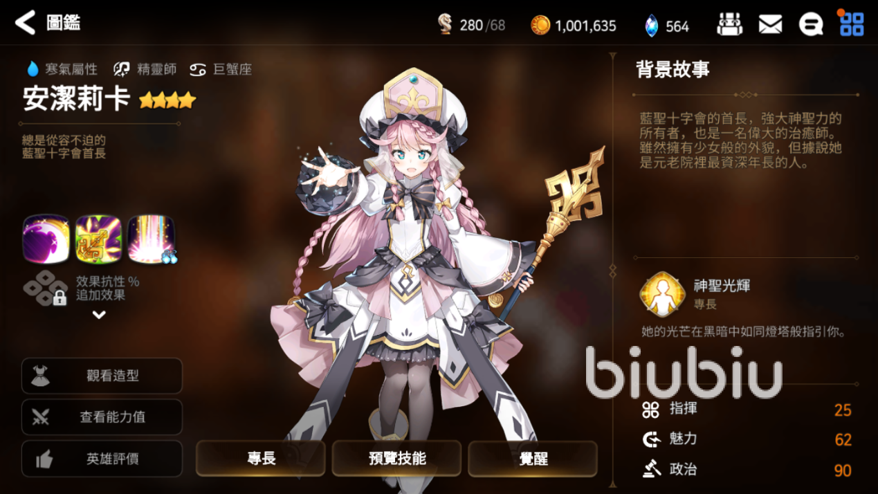 2、光之天使安潔莉卡:在最新的活動中,推出了全新的光之天使系列安潔莉卡。初始是一個4星的魔導士,在免疫眩暈效果的同時,還能為隊友提供免疫傷害效果。