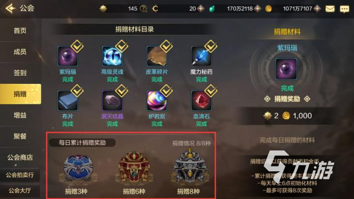 在游戲中,玩家每天可以隨機(jī)領(lǐng)取八個捐贈材料的任務(wù),通過捐贈相應(yīng)的物品就可以獲得公會貢獻(xiàn)幣的獎勵。另外,當(dāng)累計(jì)捐贈達(dá)到三次、六次、八次時,即可獲得捐贈寶箱,大家可千萬不要錯過。