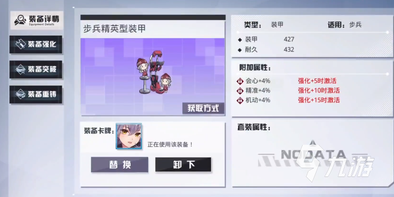 在裝甲位置上使用的裝備,基礎(chǔ)的屬性是帶來裝甲以及耐久度的提升。裝甲獲得427的加成,耐久度獲得432的加成。大家都知道步兵的輸出還是不錯(cuò)的,尤其是對(duì)于地雷。但是在防御能力上就有一些缺陷了,而這件裝備可以很好的帶來生存能力的提升。