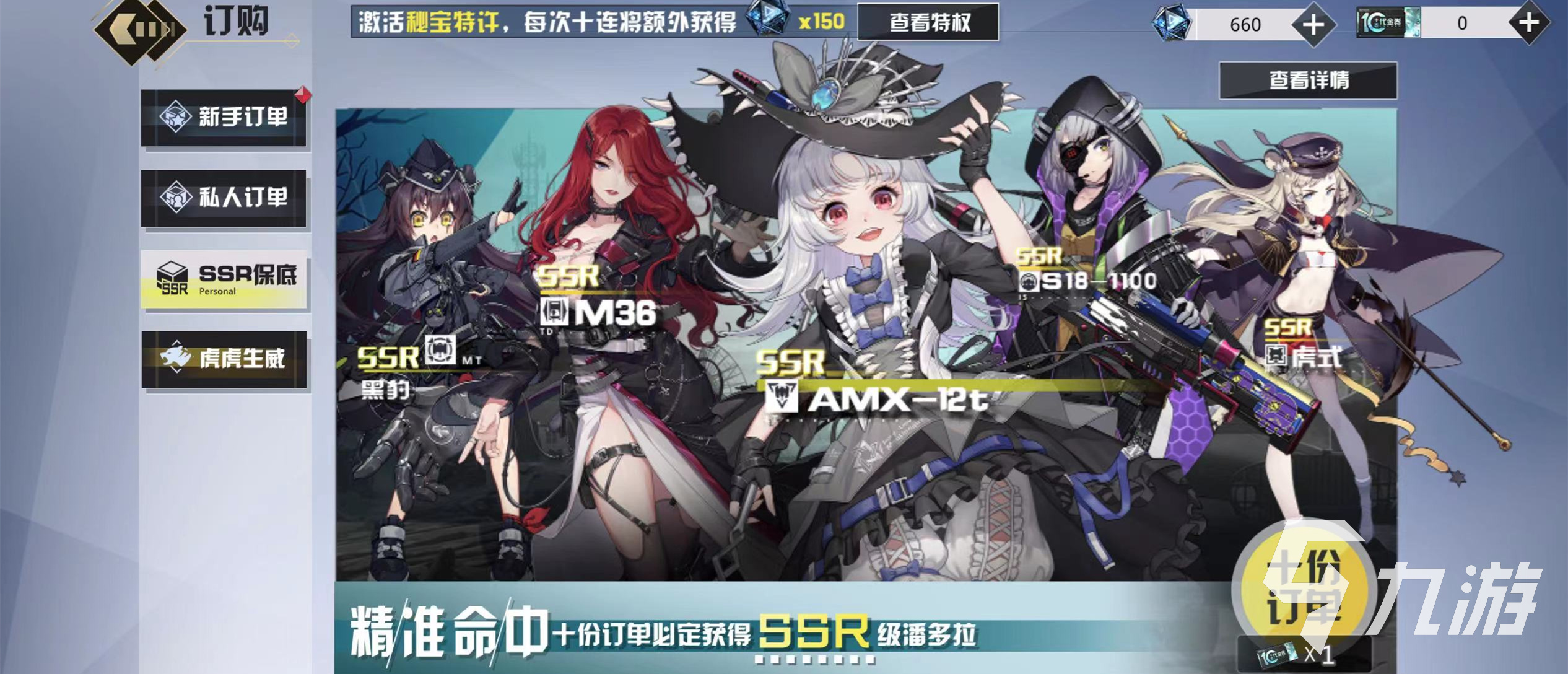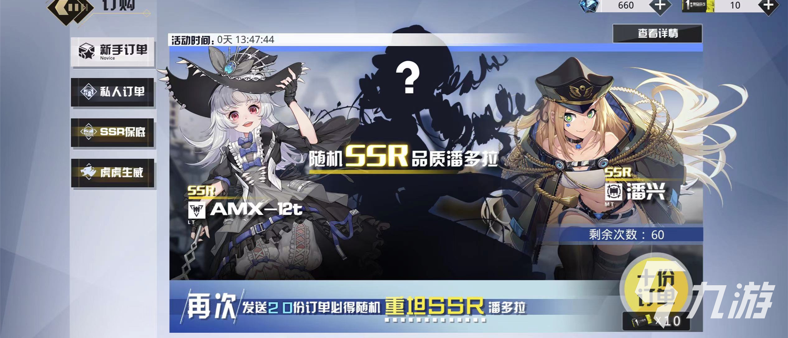 AMX12T角色的獲取方式非常簡單,目前來看只有兩種途徑可以獲取,第一種獲取途徑只需要玩家們在新手訂單里面進(jìn)行獲取,請小伙伴前往主界面右上方的訂購板塊進(jìn)入,里面有四種板塊活動,有新手訂單,私人訂單,SSR保底以及虎虎生威,點擊新手訂單板塊就能看見AMX12T人物角色,需要消耗10個代金券來激活十份訂單按鈕。