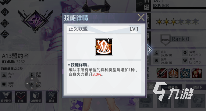 被動技能“正義聯盟”,該技能是編隊中兵種每提升一個,那么自身就可以獲得3%的火力屬性提升。這個簡單來說就是要搭配全兵種單位,可以帶來不錯的火力輸出提升。大家在搭配的時候盡量不要重復,可以獲得屬性優(yōu)勢。