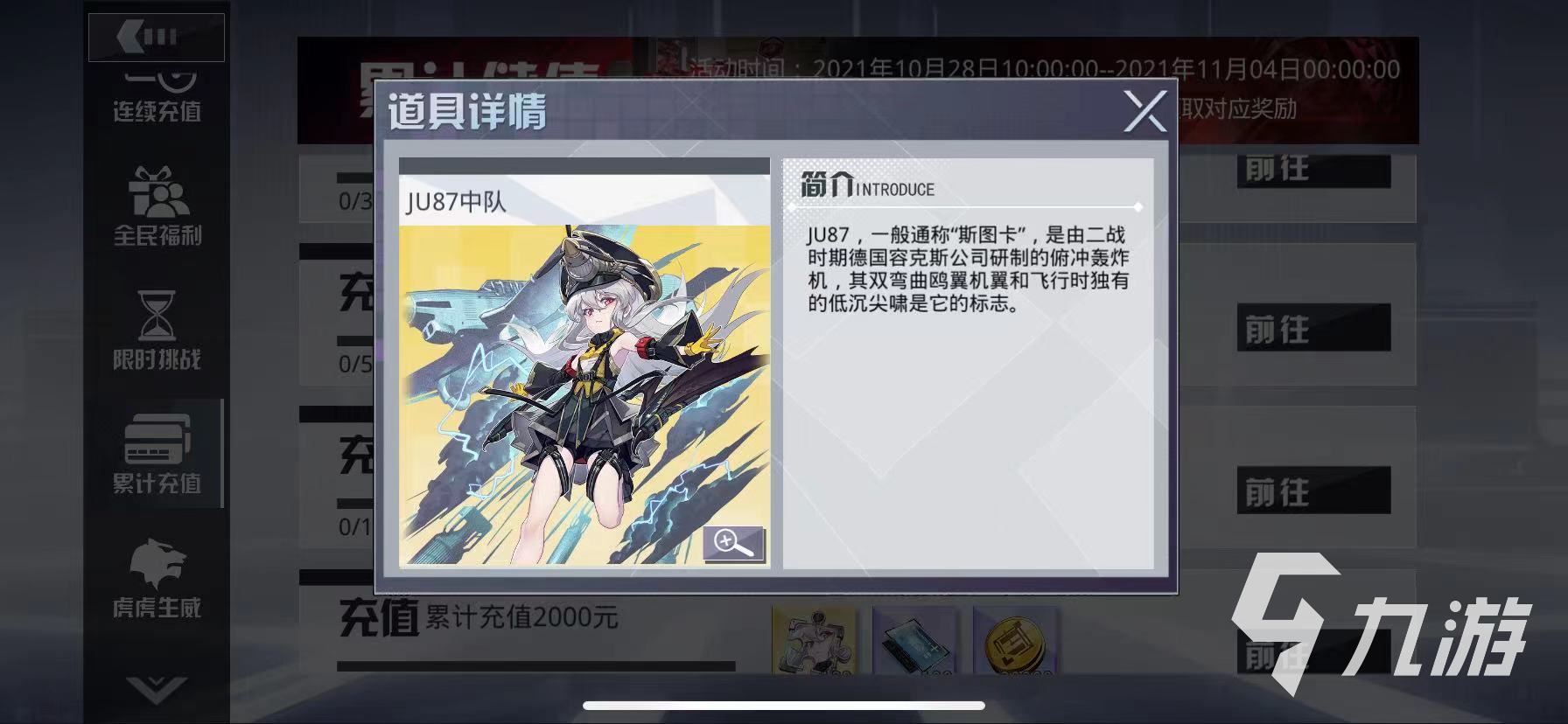 第2種方法是通過累積充值獲取,玩家可在游戲主頁面找到活動(dòng)板塊,點(diǎn)擊進(jìn)入之后選擇第2個(gè)累積充值活動(dòng),當(dāng)玩家累積充值金額達(dá)到1000元的時(shí)候即可領(lǐng)取JU87中隊(duì)。