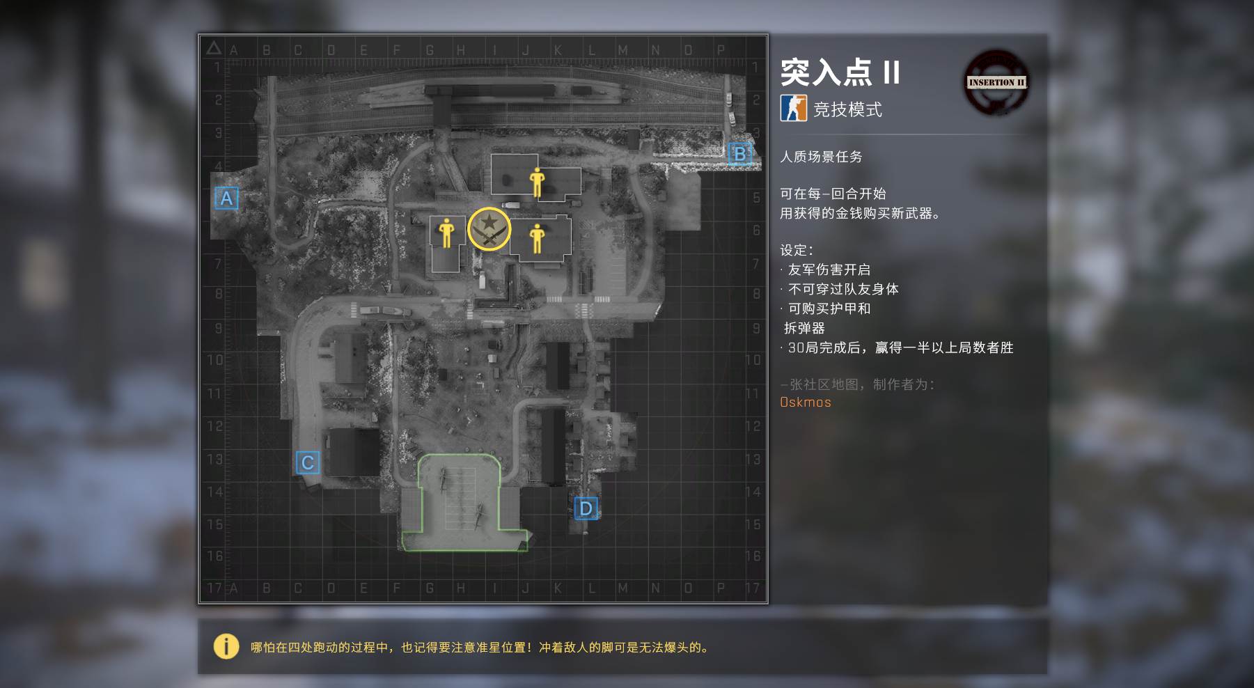突入點(diǎn)2這個地圖只能在競技模式中才能體驗(yàn)到,這張地圖的背景大約是在冬季一個下雪的日子,具體地點(diǎn)應(yīng)該是在某個小鎮(zhèn),Ct的主要任務(wù)就是負(fù)責(zé)營救藏在建筑物中的人質(zhì),地圖中大部分元素都是以樹木以及積雪為元素,還有朦朧的大霧天氣,十分適合玩家們在游戲中隱藏以及陰人。和突入點(diǎn)1不太一樣的地方在于地圖十分的寬闊,而且充滿了大霧以及烏云,在配合上,玩家們在游戲中的衣服都是深暗黑色,這就更難發(fā)現(xiàn)躲在近處狙擊的敵人。