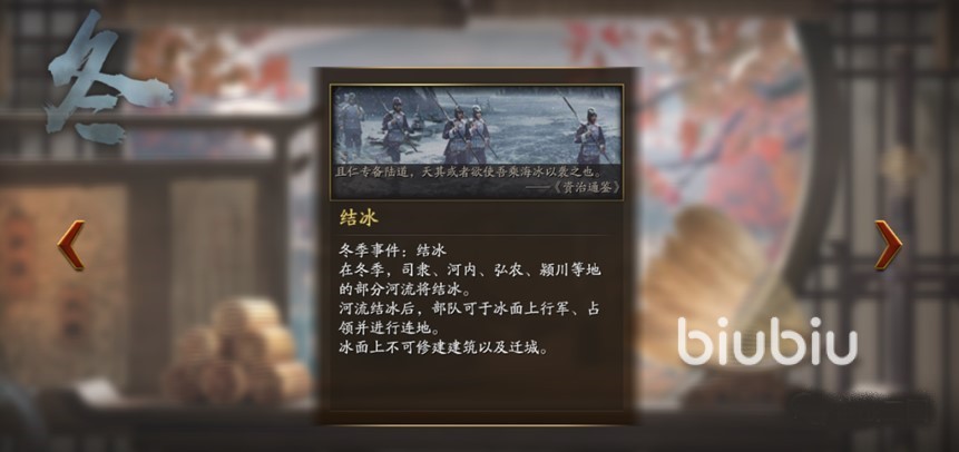 冬日感受最深的就是寒冷了,在游戲中也就有了結(jié)冰的存在,這時的所有河流都會凍結(jié)起來,軍隊(duì)甚至還能在上面行走,所以要防止這個時候過河偷襲的人。