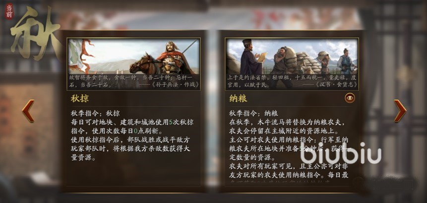 秋天的話,在這收獲的時刻也就多有爭奪的出現(xiàn),這便是游戲中秋季會有掠奪和存糧事件的原因。前者是在玩家可以在指定地點(diǎn)進(jìn)行秋掠,每日只能進(jìn)行五次。而納糧便是收獲資源,將種植的道具更換為收割的農(nóng)夫。