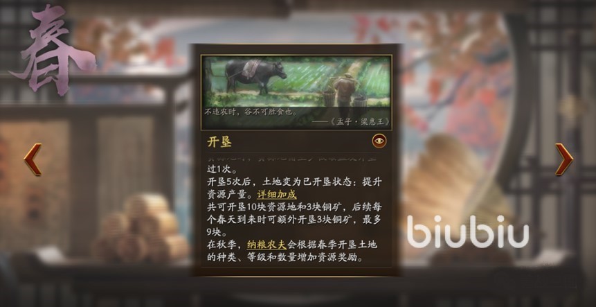 按照順序首要介紹的便是春季了,對于春大家最先想到的可能就是該種地了,所以游戲中的春天便有了開墾的事件,而這里要開墾的土地不是自家的,而是盟友的,只要對盟友的土地耕了五次,就能提高資源的產(chǎn)量,不過這是有數(shù)量限制的。