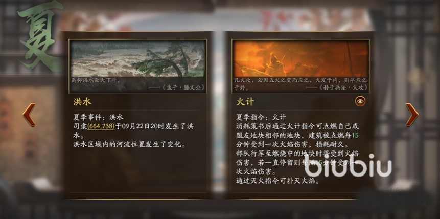 夏季的時候有些地方會發(fā)大水,而有些地方就會非常干旱,因此游戲中的夏天便有了洪水和火計(jì)兩個事件。前者是會在指定的地點(diǎn)產(chǎn)生,如果有部隊(duì)在洪水的發(fā)生地帶就會造成軍隊(duì)損失,然后會強(qiáng)行將其撤回。而后者是能將自己周邊的土地點(diǎn)燃,在其中會受到持續(xù)傷害,想要滅火就要有對應(yīng)的指令。