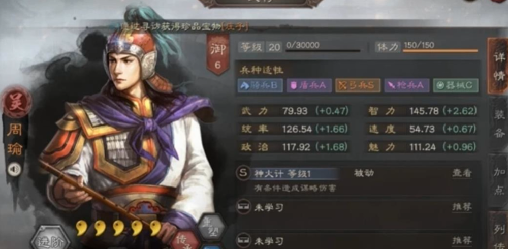 另外周瑜推薦的戰(zhàn)法為草船借箭和決水潰城,推薦的兵書為九變和援其必攻,還有勵(lì)軍和掩虛。魯肅的戰(zhàn)法推薦形一陣和暫避其峰,兵書推薦軍形和守勢(shì),還有防備和惜兵愛(ài)民。