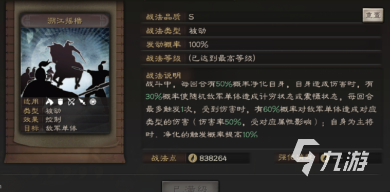 溯江搖櫓:每回合有一半的概率祛除自己身上的負面效果,自己造成傷害時會有幾率對敵人施加沉默或者暈眩效果,自己如果受到傷害,有大概率反擊敵人相同類型的傷害。吳下阿蒙作為主將時驅除負面的概率+10%。(SP吳下阿蒙的自帶被動戰(zhàn)法)
