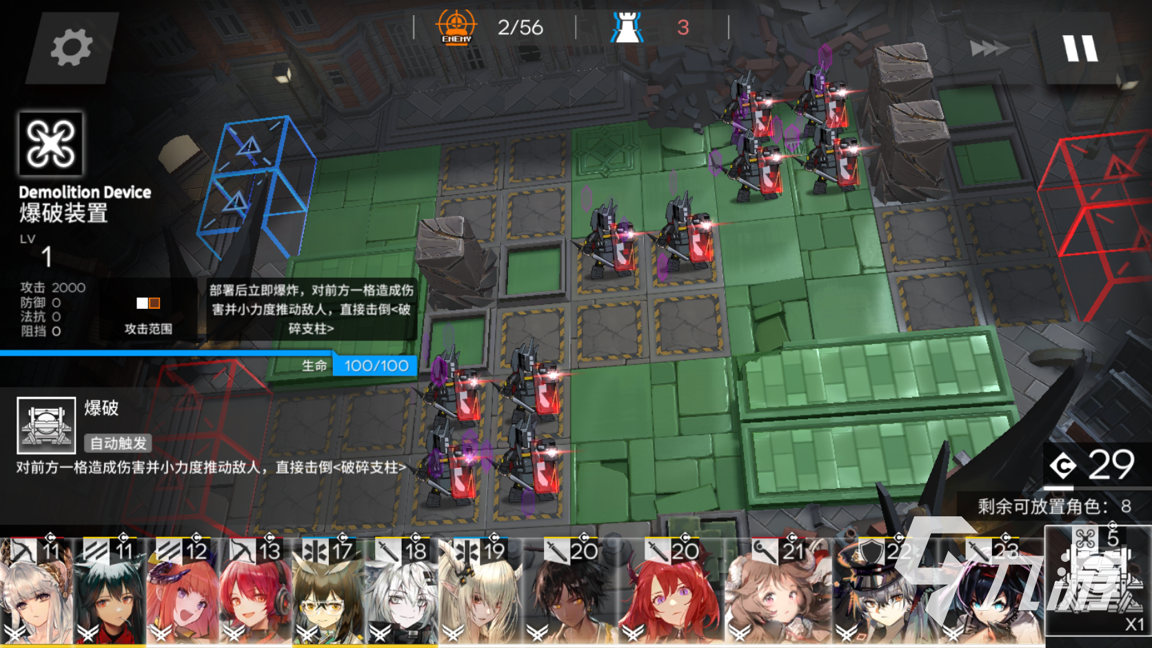 想要通過干員擊倒破碎支柱是比較耗時(shí)的,而實(shí)際作戰(zhàn)中往往對時(shí)間的把控非常嚴(yán)格,此時(shí)我們就需要用到新主線中的第二個(gè)機(jī)制道具:爆破裝置。爆破裝置在部署后會立刻爆炸,將周圍的破碎支柱直接擊倒,通過該方法玩家可以讓破碎支柱實(shí)現(xiàn)秒倒,從而將一些高速路過的敵人擊殺。