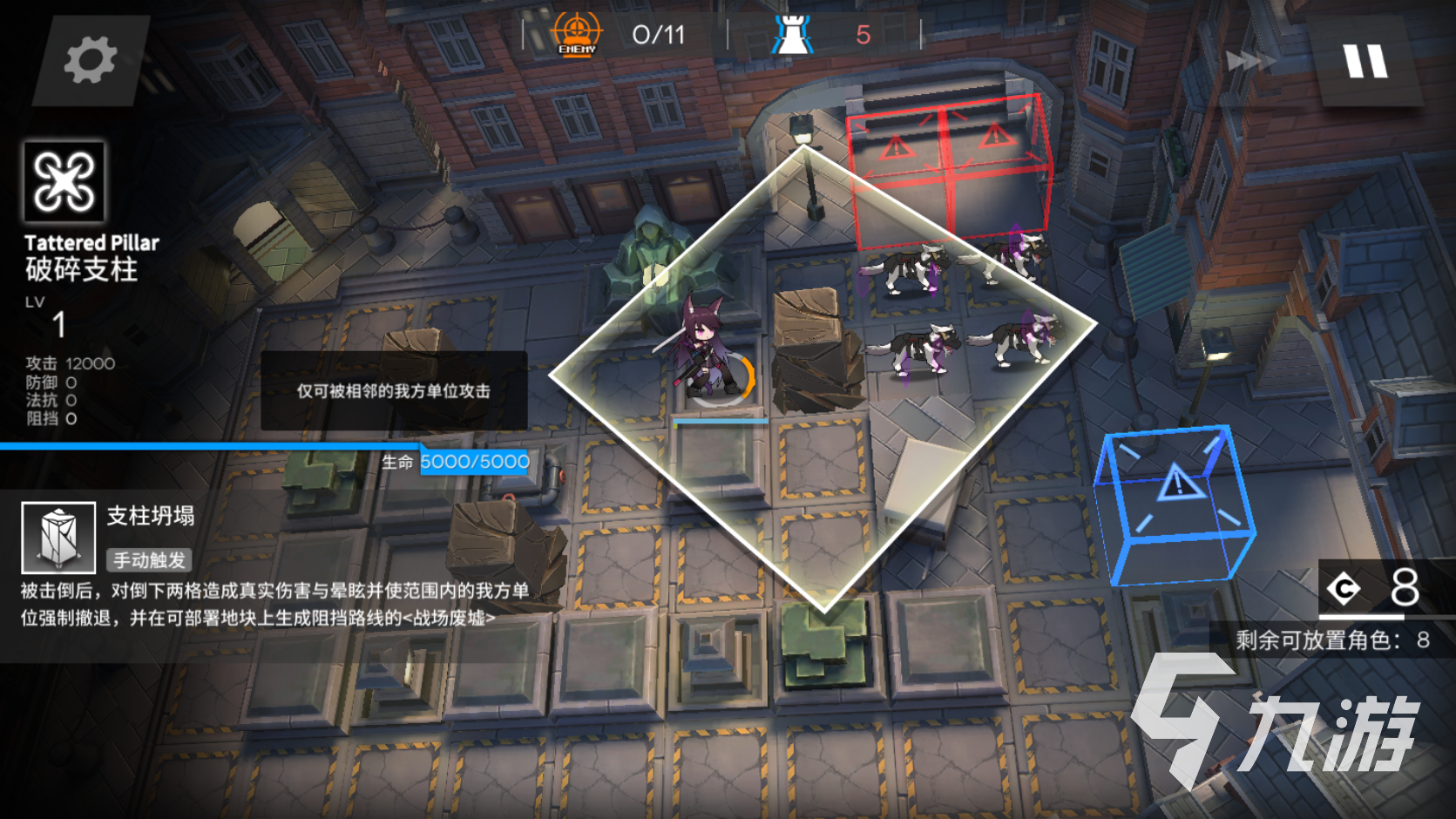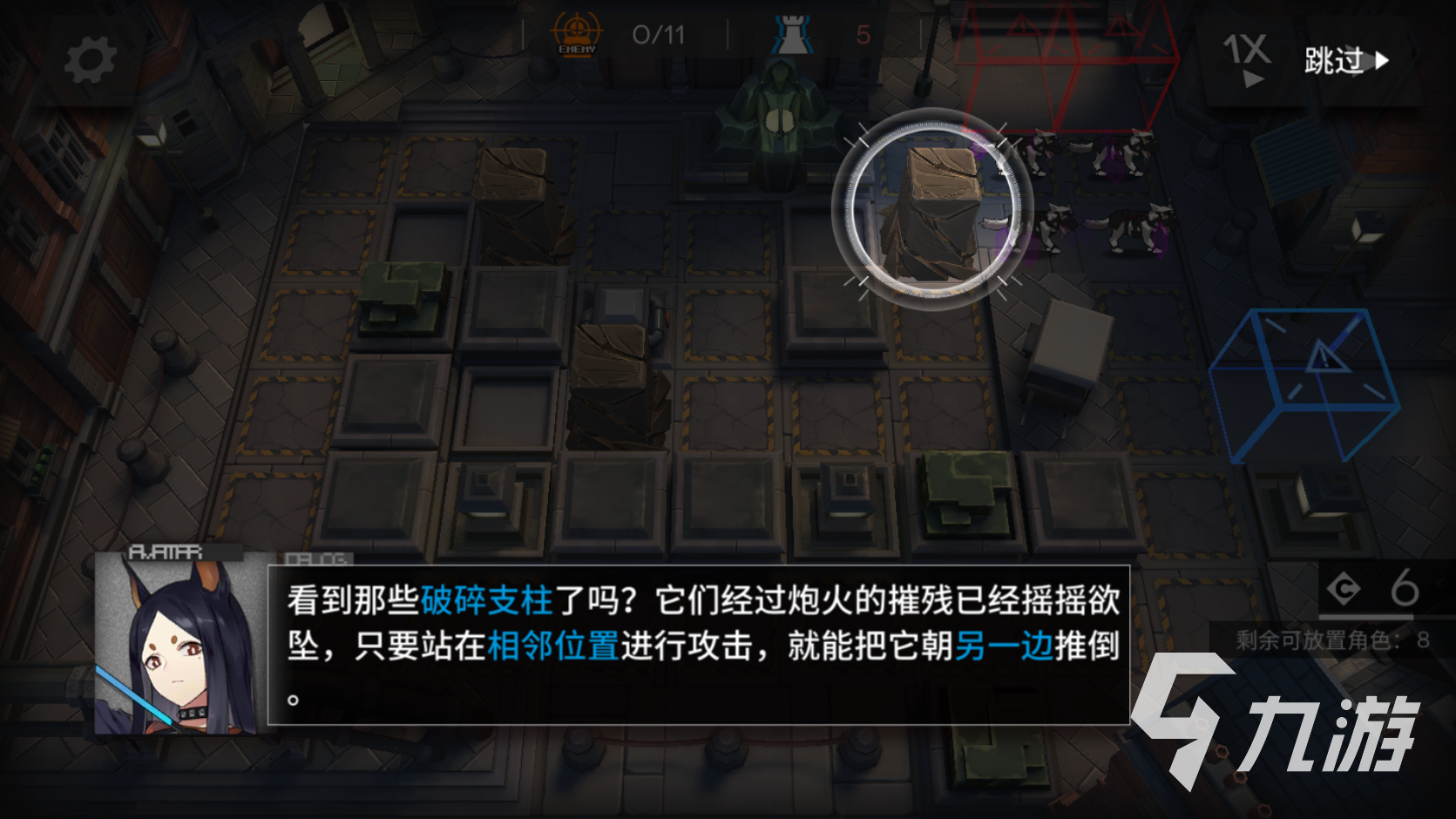實(shí)戰(zhàn)中,地圖會刷新出兩種不同的破碎支柱,大家可以通過顏色來判斷它們。深棕色的破碎支柱在倒地后會形成一個(gè)1x2的區(qū)域,該區(qū)域會被視為障礙物,敵方無法通過。而淺灰色的破碎支柱只會在倒地時(shí)對倒地區(qū)域造成高額的真實(shí)傷害,并不會形成障礙物。我們可以通過在破碎支柱周圍部署干員的形式來將其擊倒,擊倒的方向就是部署干員攻擊的方向,需要注意的是,倒下的破碎支柱如果命中了我方干員,則會造成強(qiáng)制離場,即便鎖血也會受到影響。